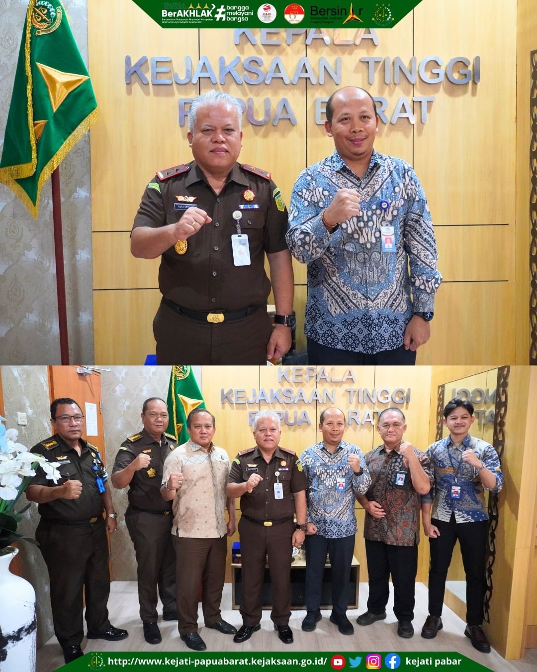 Kepala Kejaksaan Tinggi Papua Barat, Dr. Harli Siregar, S.H., M.Hum menerima kunjungan Plt. Kepala Perwakilan BPKP Papua Barat, Lepot Setyanto, Ak., M.Si, didampingi Koordinator Pengawasan (Korwas) Bidang Investigasi, Sjachroel Hidhayat Siregar, SE, dan Auditor Trampil Pemula, Wins Mosca Pratama, Rabu 18 Oktober 2023.