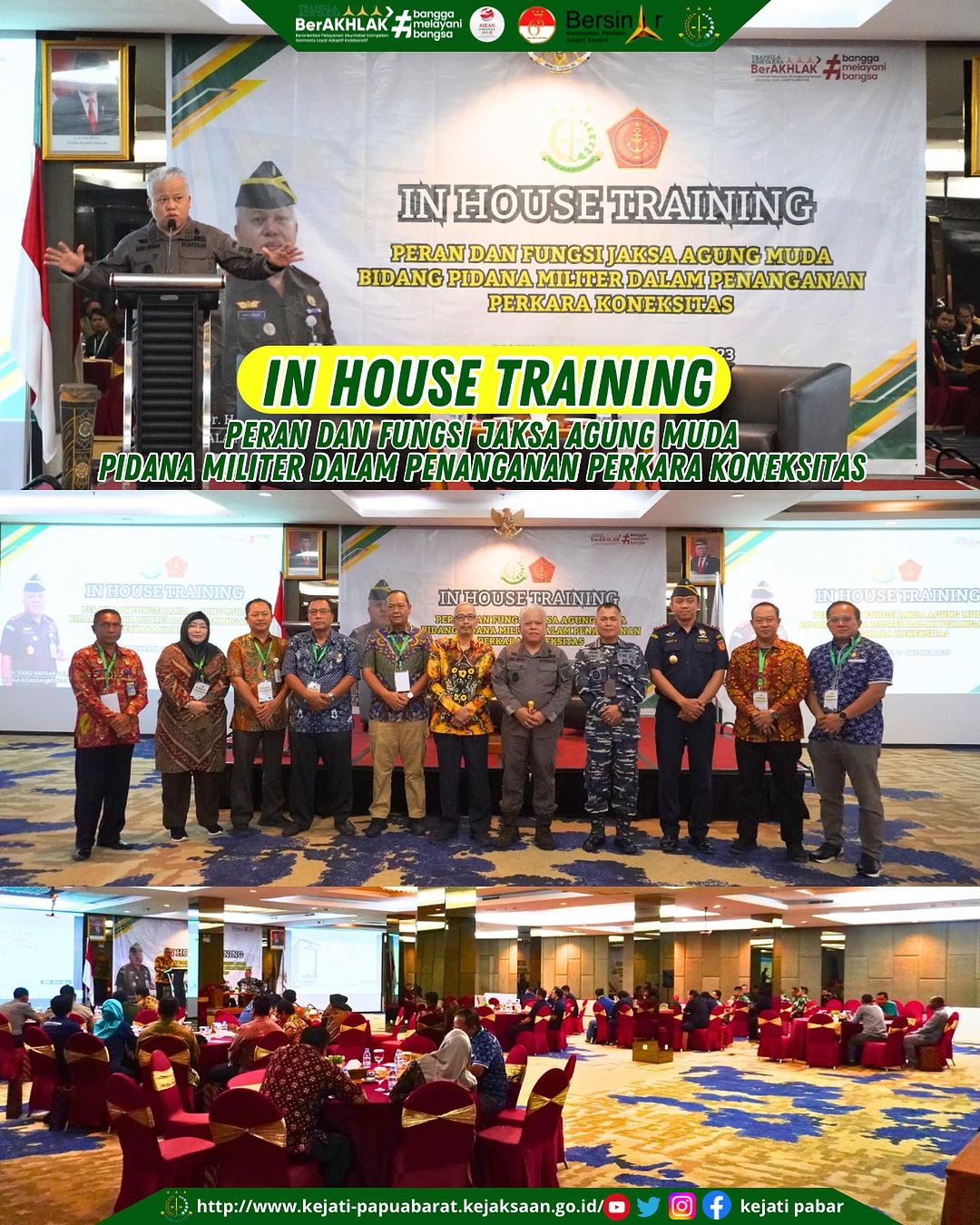 Kepala Kejaksaan Tinggi Papua Barat Dr. Harli Siregar, S.H., M.Hum membuka kegiatan In House Training “Peran dan Fungsi Jaksa Agung Muda Bidang Pidana Militer dalam Penanganan Perkara Koneksitas”, Jumat, 20 Oktober 2023 bertempat di Kaimana Ballroom Hotel Swissbell Manokwari.