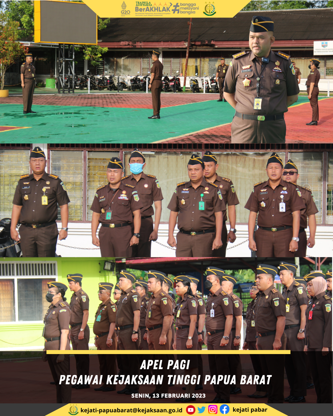 Kejaksaan Tinggi Papua Barat melaksanakan apel pagi yang bertindak sebagai pemimpin yaitu Asisten Perdata dan Tata Usaha Negara Rahcmad Surya Lubis, S.H., M.Hum. yang bertempat di halaman Kantor Kejaksaan Tinggi Papua Barat, Senin 13 Februari 2023.