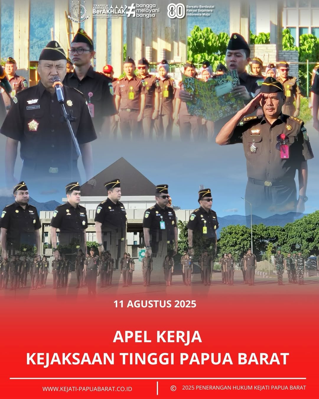 Senin 11 Agustus 2025 bertempat di Lapangan Kantor Kejaksaan Tinggi Papua Barat dilaksanakan Apel Pagi yang dipimpin oleh Asisten Bidang Pidana Khusus, AGUSTIAWAN UMAR, S.H., M.H.