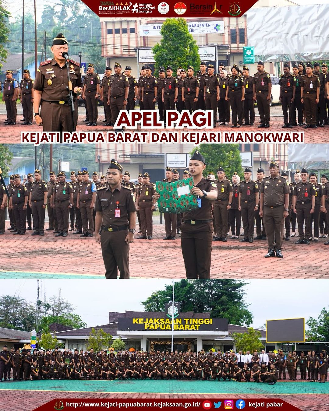 Apel pagi diikuti oleh Para- Asisten, Kajari Manokwari, Para- Koordinator, Kabag TU, dan Seluruh Pegawai Kejaksaan Tinggi Papua Barat, dan Seluruh Pegawai Kejaksaan Negeri Manokwari.