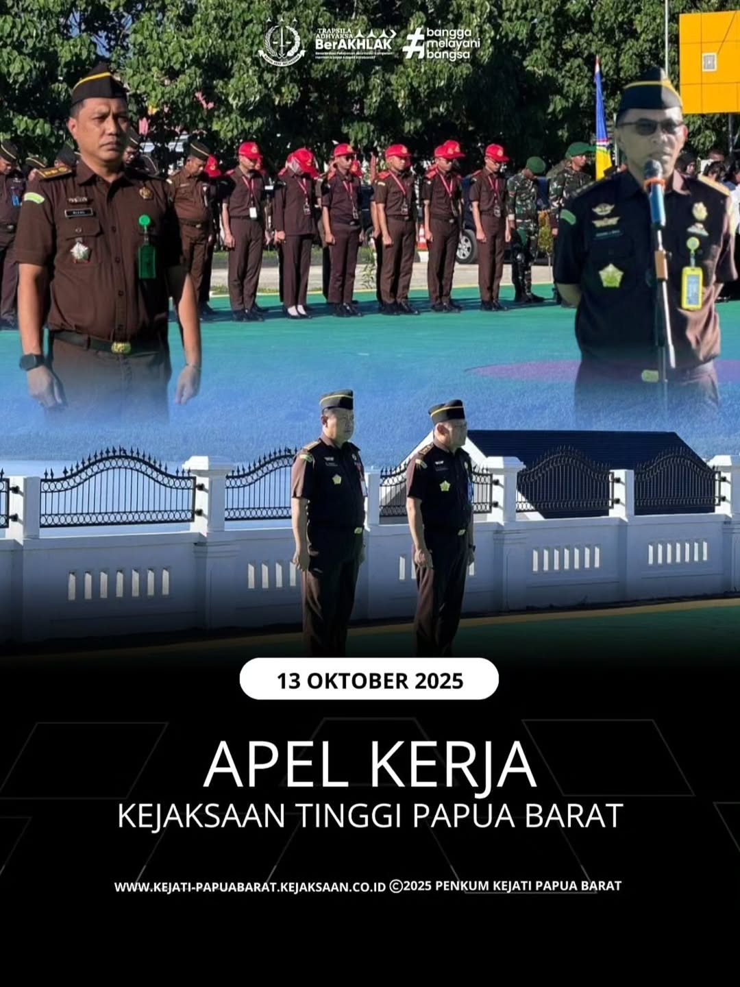 Senin, 13 Oktober 2025 Pukul 07.30 WIT, bertempat di Halaman Kantor Kejaksaan Tinggi Papua Barat, Asisten Pembinaan Kusuma Jaya Bulo, S.H., M.H. memimpin Apel Pagi pada Kejaksaan Tinggi Papua Barat dan diikuti oleh seluruh Pegawai, CPNS, TNI dan PPNPN di lingkungan Kejaksaan Tinggi Papua Barat.