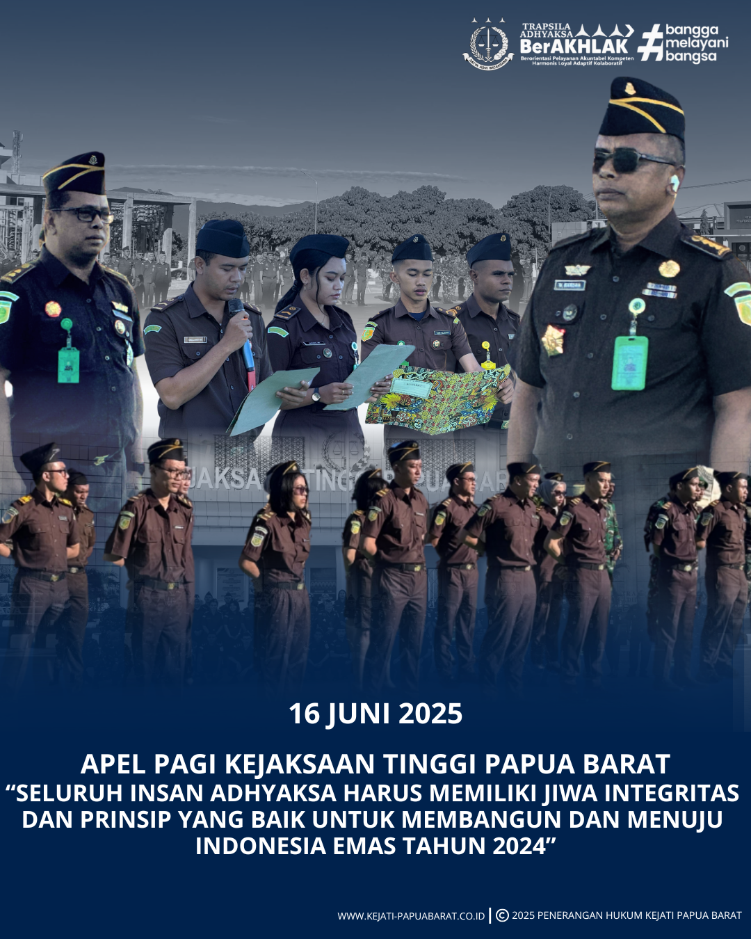 Senin, 16 Juni 2025 bertempat di Lapangan Kantor kejaksaan Tinggi Papua Barat, Asisten Intelijen Muhammad Bardan, S.H., M.H. memimpin Apel Pagi dengan penyampaian mengajak “Seluruh Adhyaksa Muda Kejati Papua Barat yang diharuskan Memiliki Jiwa Integritas dan Prinsip yang Baik untuk Membangun dan Menuju Indonesia Emas Tahun 2025.
