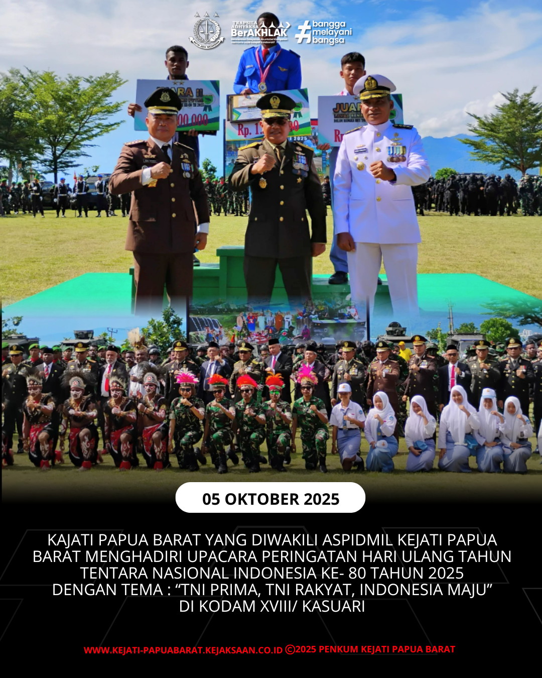 Minggu, 05 September 2025 bertempat di Lapangan Kodam XVIII/ Kasuari, Kepala Kejaksaan Tinggi Papua Barat yang diwakili Asisten Pidana Militer Kolonel Laut (KH) Ridho Sihombing, S.H., M.H. menghadiri Upacara Peringatan HUT Tentara Nasional Indonesia (TNI) Ke- 80 Tahun 2025 dengan tema “TNI Prima, TNI Rakyat, Indonesia Maju”.