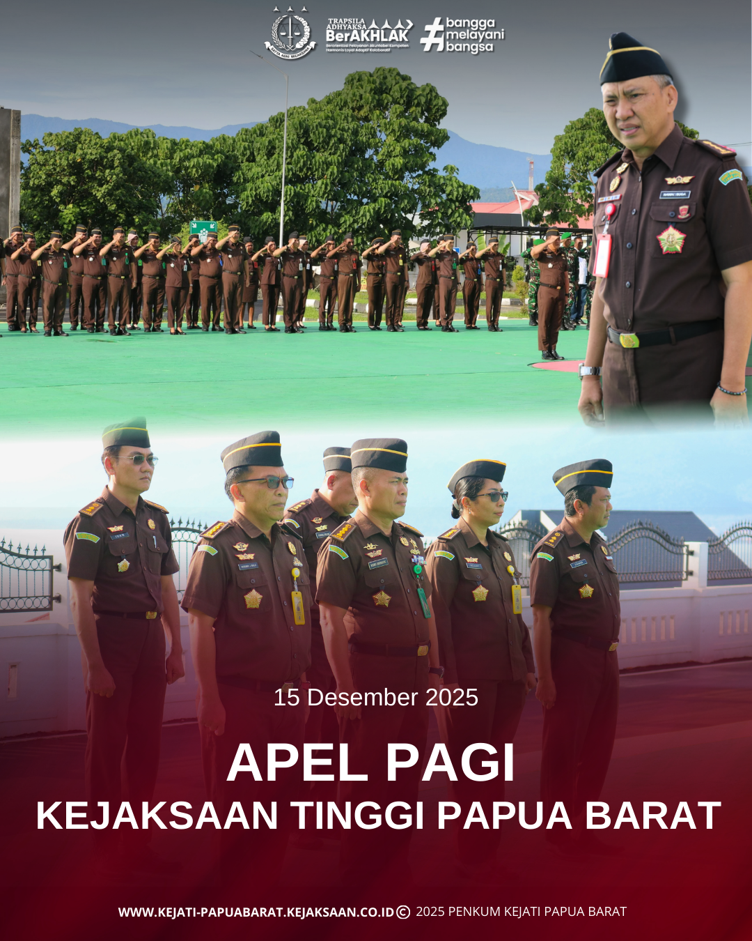 Senin 15 Desember 2025 pukul 07.30 WIT bertempat di Lapangan Apel Kantor Kejaksaan Tinggi Papua Barat, Asisten Tindak Pidana Khusus Agustiawan Umar, S.H., M.H. selaku penerima apel, memimpin Apel Pagi Kejaksaan Tinggi Papua Barat.