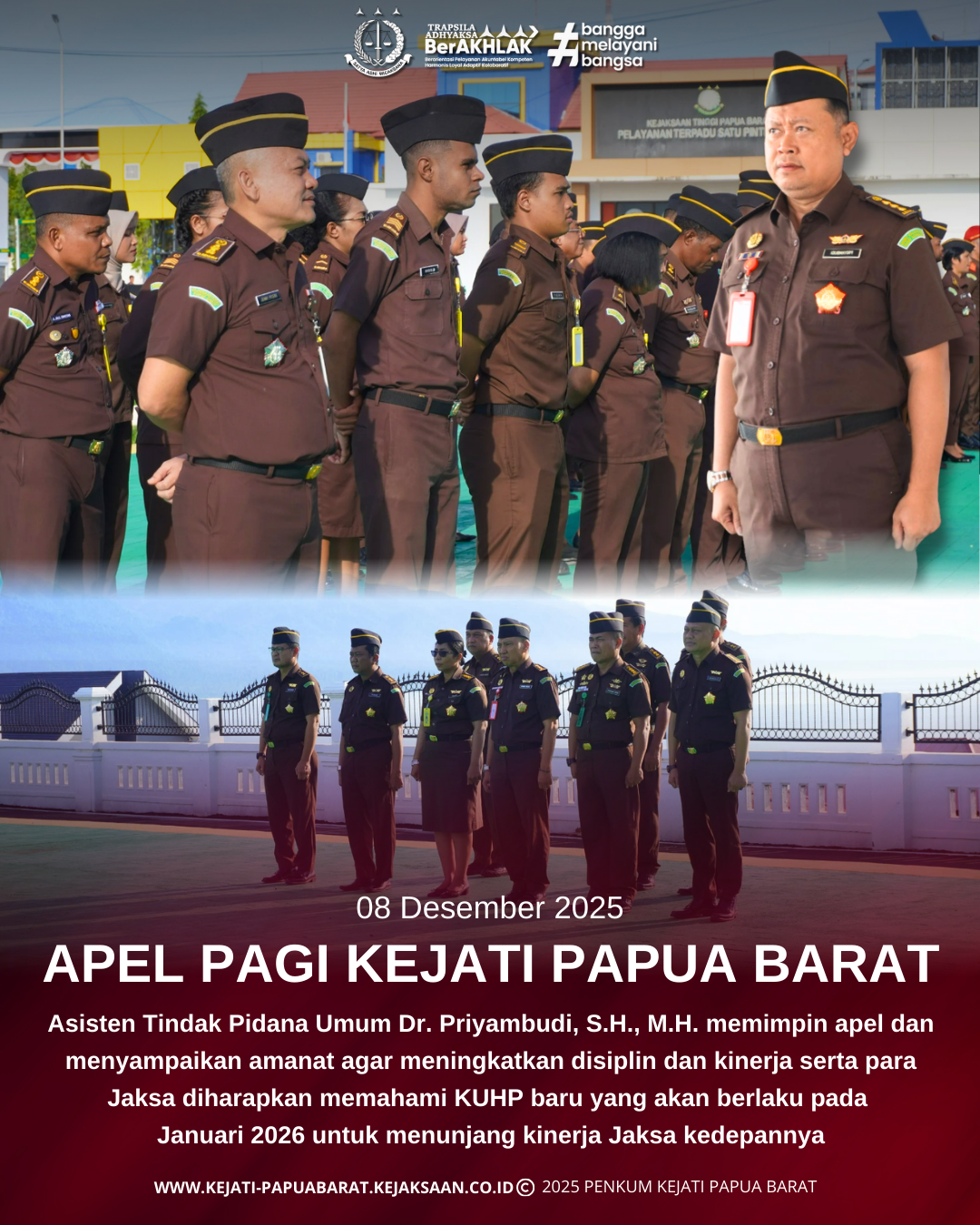 Senin 08 Desember 2025 Pukul 07.30 WIT bertempat di Lapangan Apel Kantor Kejaksaan Tinggi Papua Barat, Asisten Tindak Pidana umum Dr. Priyambudi, S.H., M.H. selaku penerima Apel memimpin Apel Pagi Kejaksaan Tinggi Papua Barat yang diikuti oleh seluruh Pegawai, CPNS, dan PPNP pada Kejaksaan Tinggi Papua Barat.