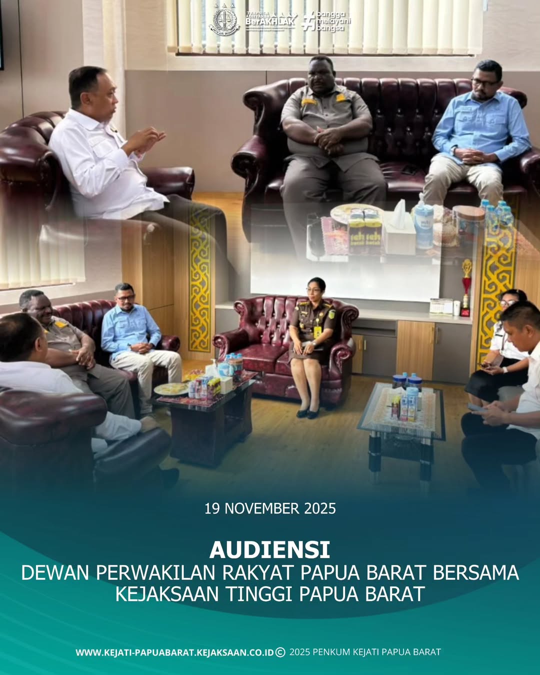 Pada hari Rabu, 19 November 2025 bertempat di ruang kerja Plh. Kepala Kejaksaan Tinggi Papua Barat, Dewan Perwakilan Rakyat (DPR) Papua Barat menjalin kerja sama dan silaturahmi dengan Kejaksaan Tinggi Papua Barat untuk berkomunikasi dan koordinasi dalam pelayanan di bidang hukum yang di dampingi oleh Plh. Kepala Kejaksaan Tinggi Barat, Luhur Istighfar, S.H., M.Hum., bersama Asisten Perdata dan Tata Usaha Negara, Meilany, S.H., M.H.