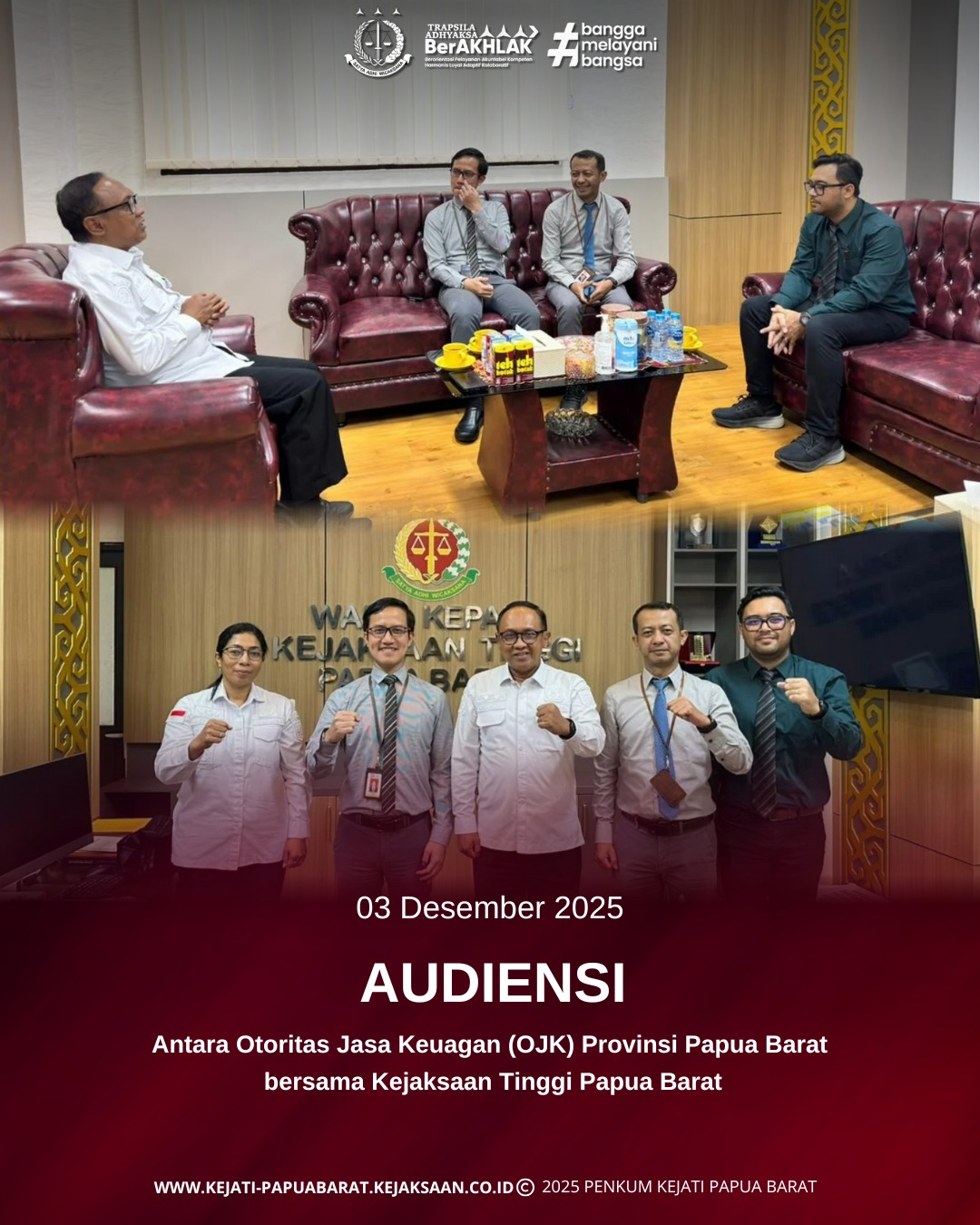 Rabu 03 Desember 2025 bertempat di Ruang Kerja Plh. Kepala Kejaksaan Tinggi Papua Barat, Plh. Kepala Kejaksaan Tinggi Papua Barat Luhur Istighfar, S.H., M.Hum menerima Audiensi Otoritas Jasa Keuangan (OJK) Provinsi Papua Barat.
