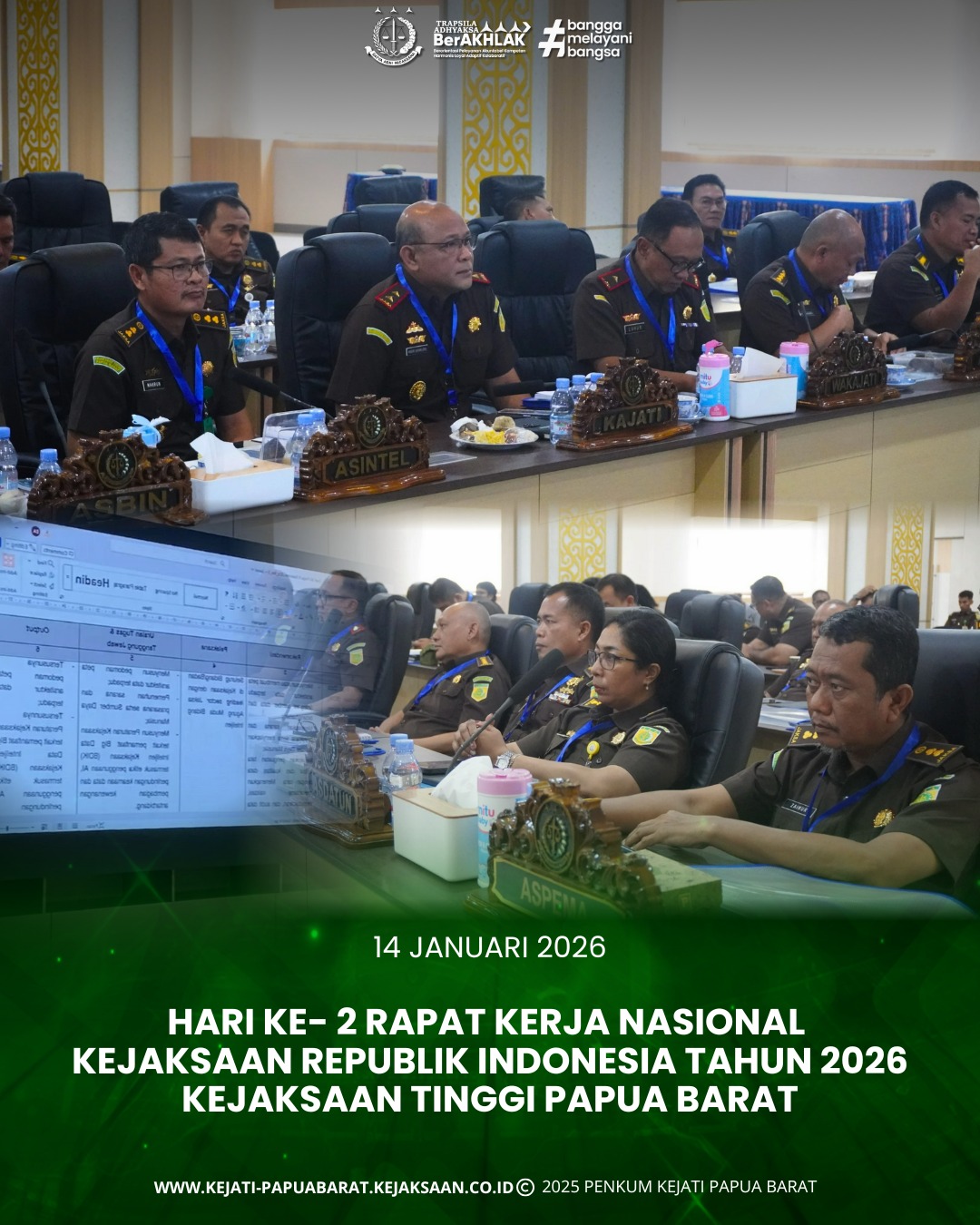 Rabu, 14 Januari 2025 pukul 10.00 WIT bertempat di Aula Lantai 4 Kantor Kejaksaan Tinggi Papua Barat, Kajati Papua Barat Basuki Sukardjono, S.H., M.H. dan Wakajati Papua Barat Luhur Istighfar, S.H., M.Hum. beserta Para Asisten, Kabag TU dan Koordinator mengikuti Rakernas Kejaksaan RI Tahun 2026 dengan Agenda “Rapat Pokja” dimana dibagi menjadi 3 pembahasa strategis Pokja, yang meliputi Pokja I (Bidang Pembinaan, Pengawasan dan Badan Diklat Kejaksaan RI), Pokja II (Bidang Pidana Umum, Pidana Khusus, dan Pidana Militer), dan Pokja III (Bidang Perdata dan Tata Usaha Negara, Bidang Intelijen dan Badan Pemulihan Aset) dan kegiatan berlangsung pada tahap Penetapan dokumen usulan kebutuhan riil tahun 2027 serta kegiatan Prioritas Nasional, dokumen laporan tahunan Kejaksaan, Corporate Value Kejaksaan RI Tahun 2027.