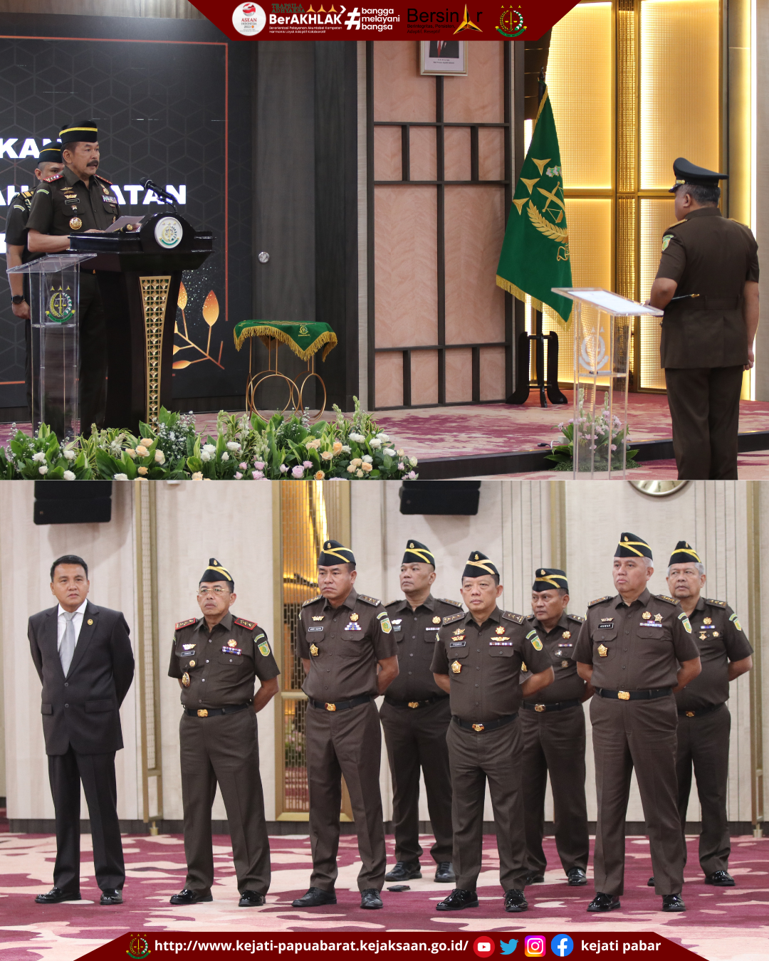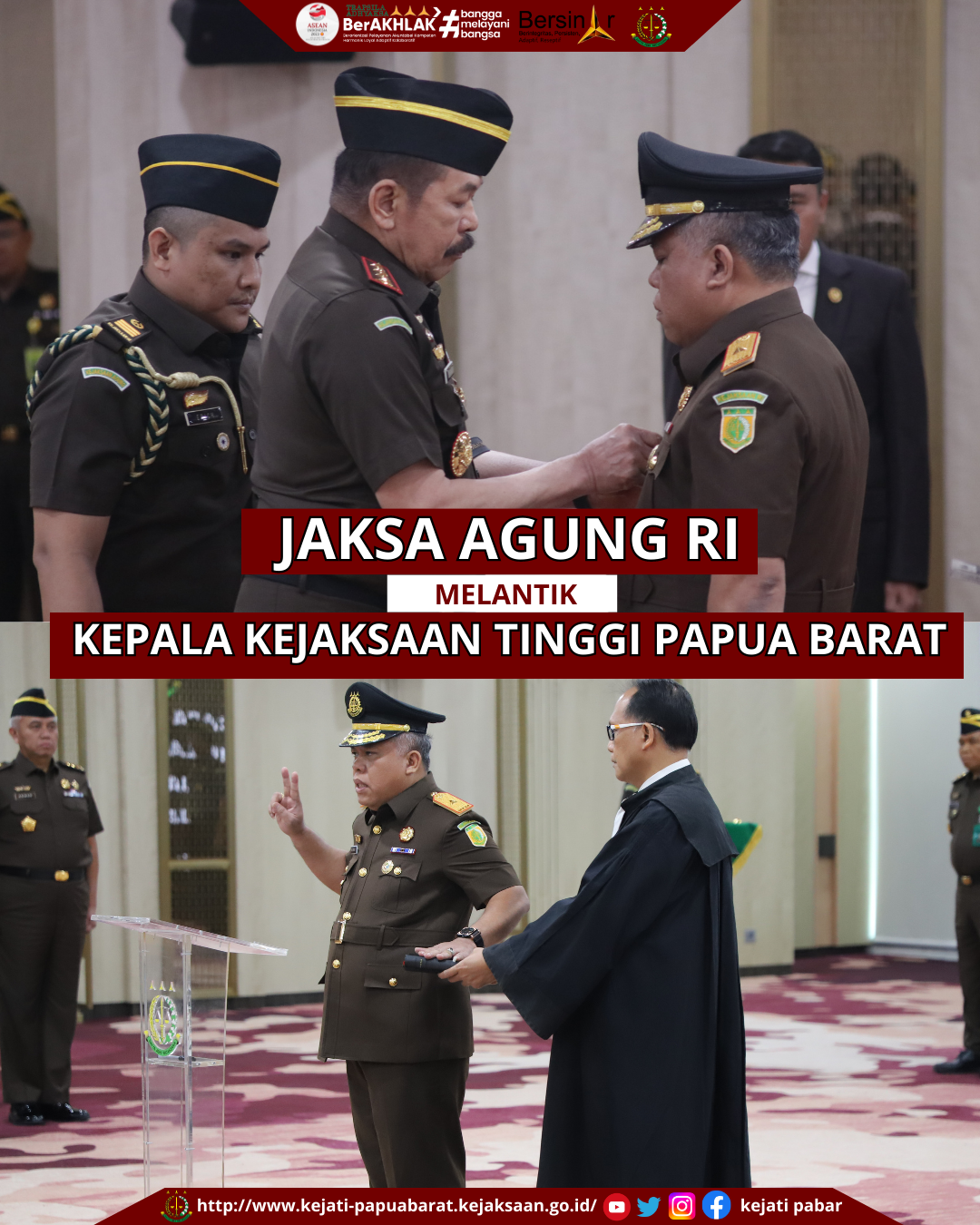 Jaksa Agung mengucapkan selamat kepada Kepala Kejaksaan Tinggi Papua Barat yang baru saja dilantik. Jaksa Agung yakin dan optimis bahwa penempatan pejabat yang baru dilantik telah tepat dan akan berkontribusi, memberikan manfaat positif bagi terwujudnya Kejaksaan yang profesional, modern, bermartabat dan terpercaya.