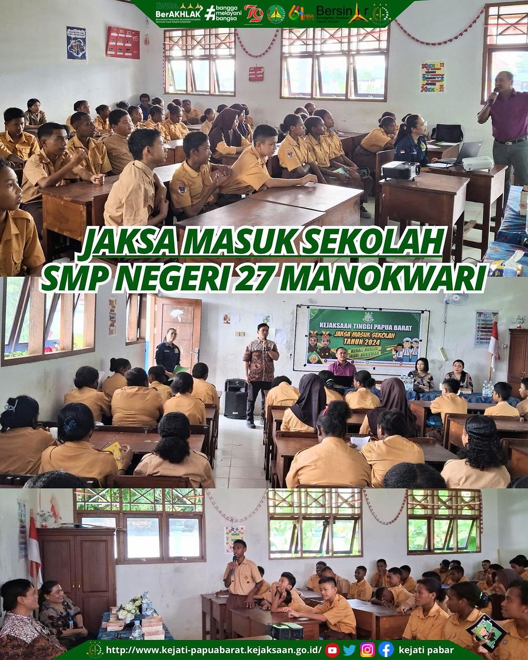 Jumat, 30 Agustus 2024, Kejaksaan Tinggi Papua Barat Bidang Intelijen melaksanakan Penyuluhan Hukum Jaksa Masuk Sekolah (JMS) di SMP Negeri 27 Manokwari.