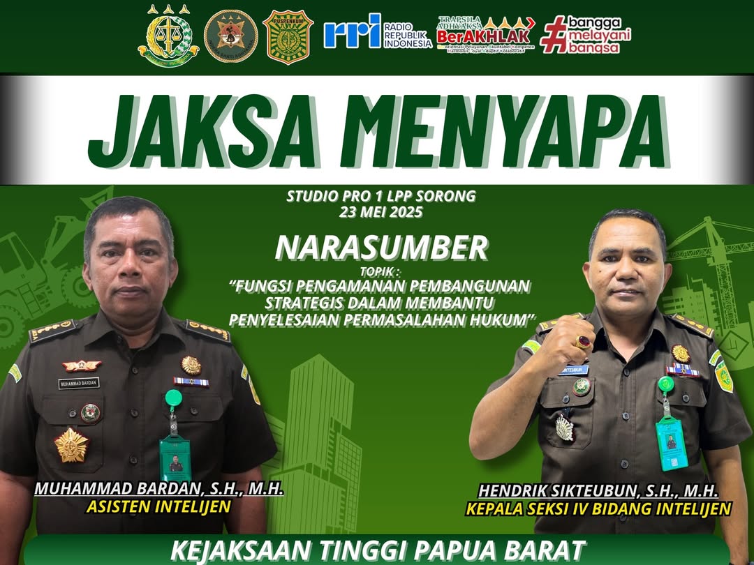 Jangan lupa dengarkan Jaksa Menyapa di Radio RRI Studio Pro 1 LPP Sorong, Jumat 23 Mei 2025 dengan Narasumber Asisten Intelijen Muhammad Bardan, S.H., M.H. dan Kepala Seksi IV Bidang Intelijen Hendrik Sikteubun, S.H., M.H. dengan tema “Fungsi Pengamanan Pembangunan Strategis Dalam Membantu Penyelesaian Permasalahan Hukum”.