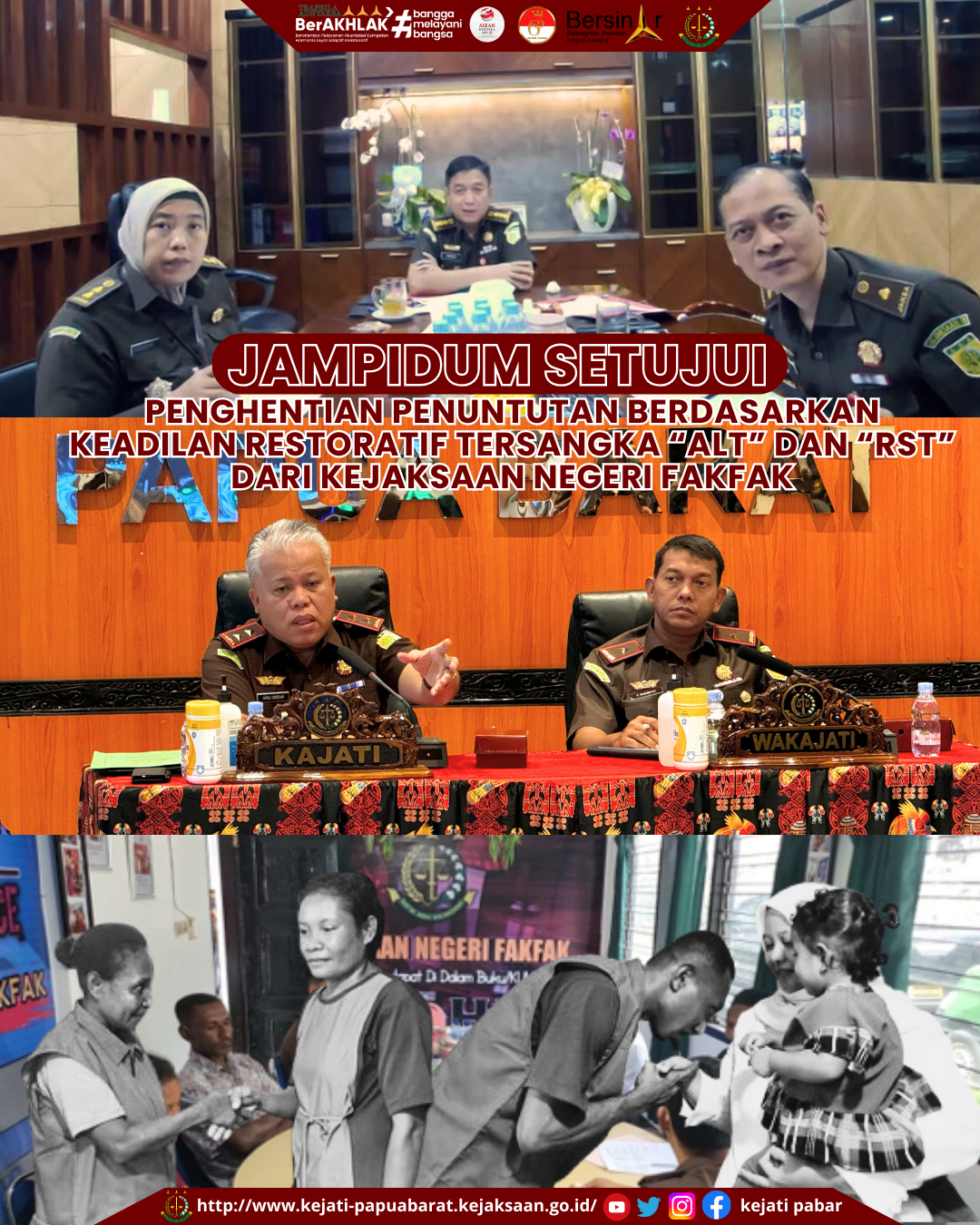 Senin 04 Desember 2023, Jaksa Agung RI melalui Jaksa Agung Muda Tindak Pidana Umum (JAM-Pidum) menyetujui permohonan penghentian penuntutan berdasarkan keadilan restoratif, Tersangka RITA SAHARA TANGGARERI dari Kejaksaan Negeri Fakfak, yang disangka melanggar Pasal 351 Ayat (1) KUHP tentang Penganiayaan, dan Tersangka ABDUL LATIF TURUA yang disangka melanggar Pasal Pasal 44 Ayat (1) UU No. 23 Tahun 2004 tentang PKDRT.
