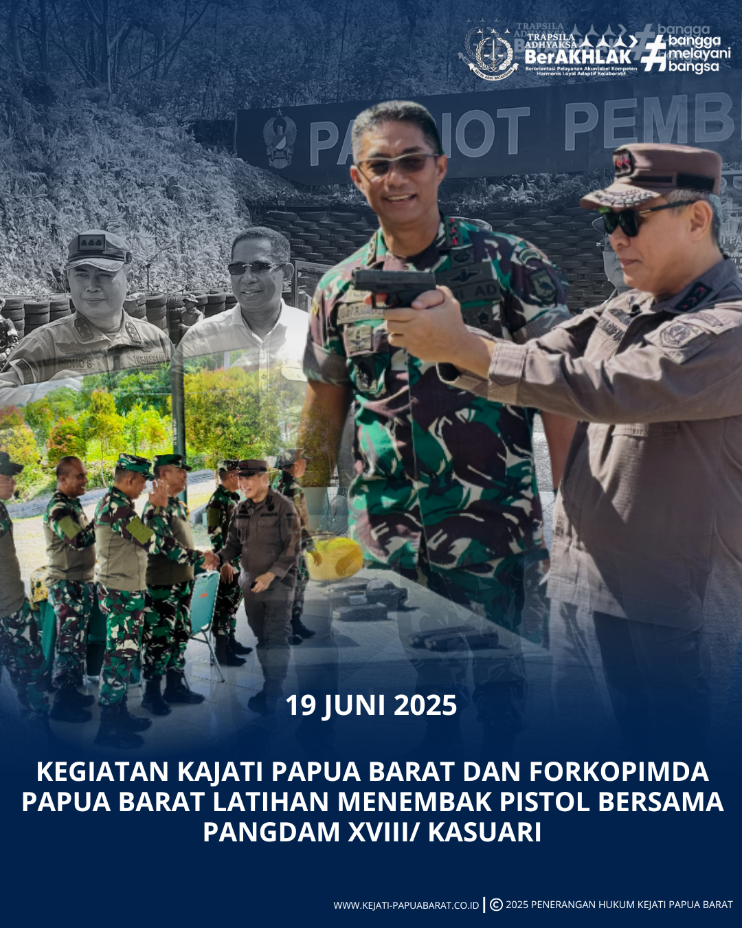 Kamis, 19 Juni 2025 bertempat di Lapangan Tembak Kodam XVIII/ Kasuari, Kepala Kejaksaan Tinggi Papua Barat dan Forkopimda Papua Barat mengikuti kegiatan Latihan Menembak Pistol Bersama Pangdam XVIII/ Kasuari.