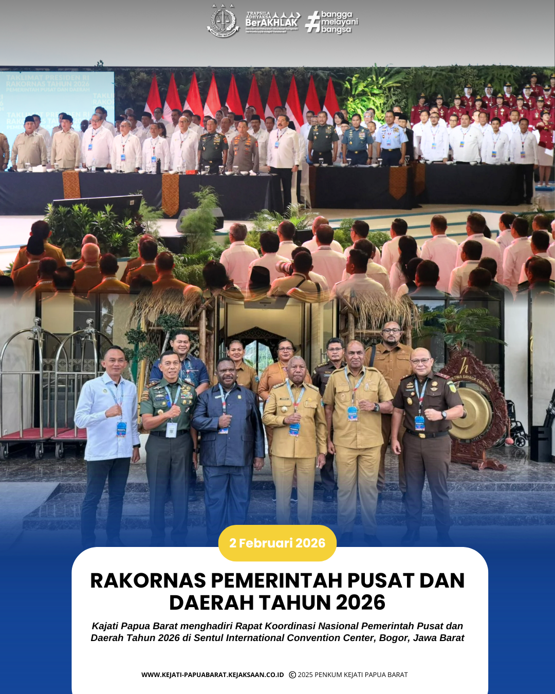 Senin 2 Februari 2026 bertempat di Sentul International Convention Center, Bogor, Jawa Barat, Kepala Kejaksaan Tinggi Papua Barat Basuki Sukardjono, S.H., M.H. menghadiri Rapat Koordinasi Nasional Pemerintah Pusat dan Daerah Tahun 2026.