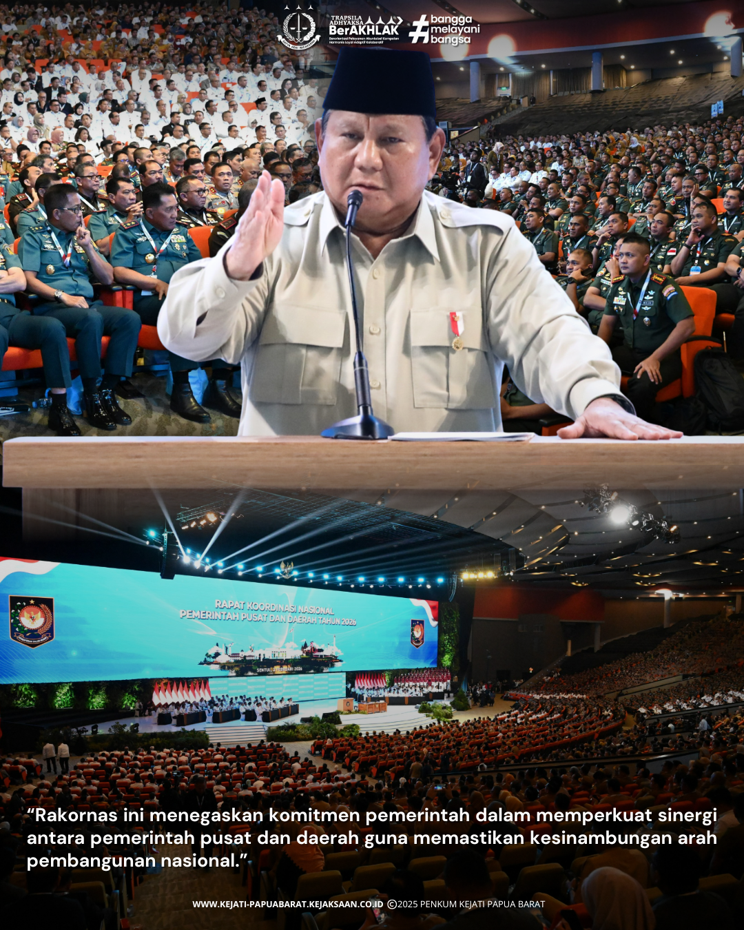 Senin 2 Februari 2026 bertempat di Sentul International Convention Center, Bogor, Jawa Barat, Kepala Kejaksaan Tinggi Papua Barat Basuki Sukardjono, S.H., M.H. menghadiri Rapat Koordinasi Nasional Pemerintah Pusat dan Daerah Tahun 2026.