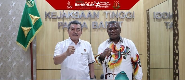 Kepala Kejaksaan Tinggi Papua Barat Juniman Hutagaol, S.H., M.H menerima audiensi Ketua Komisi Pemilihan Umum Provinsi Papua Barat Paskalis Semunya, S.Sos bertempat di Kejaksaan Tinggi Papua Barat, Manokwari, Selasa 7 Februari 2023.