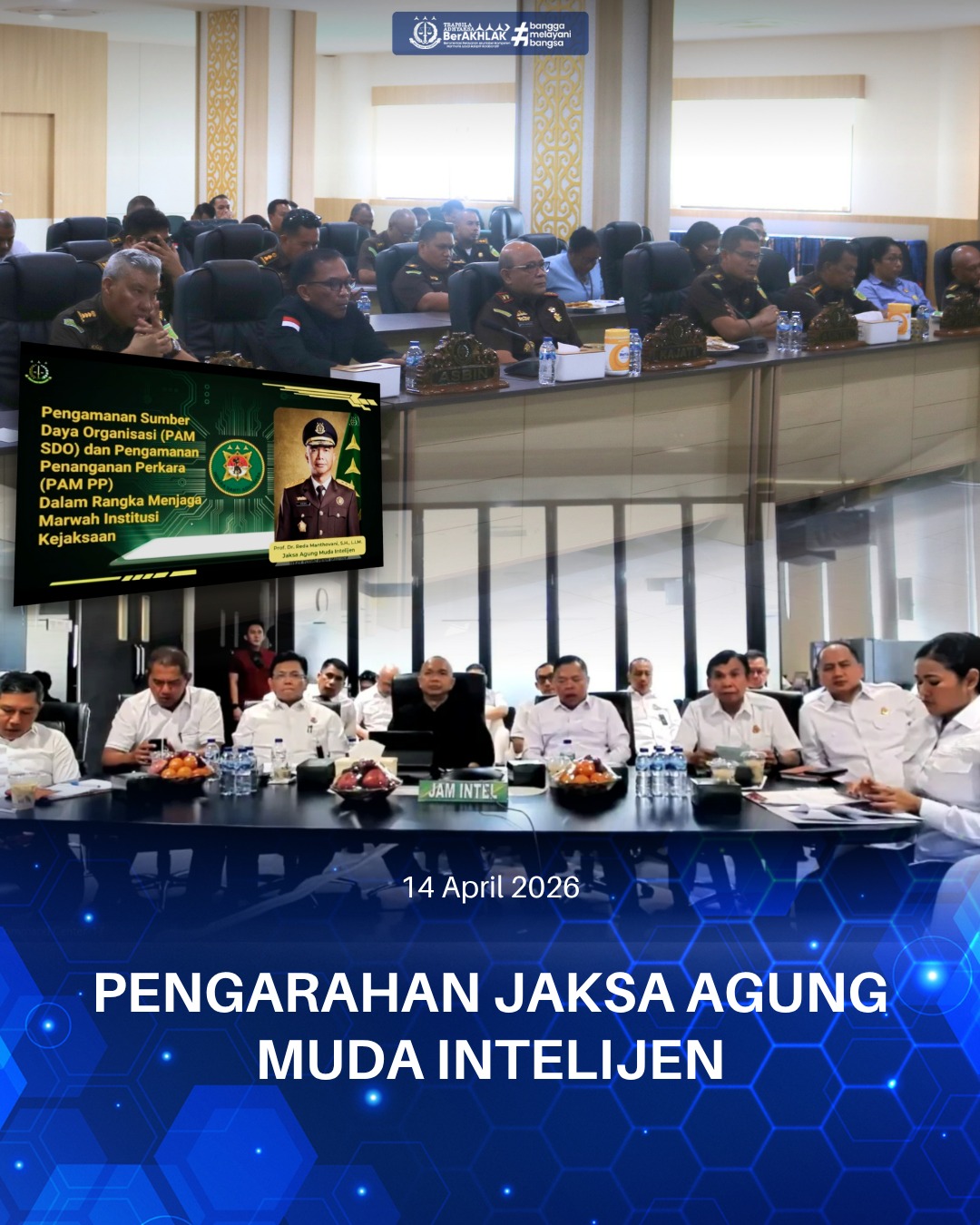 Selasa, 14 April 2026 pukul 11.00 WIT bertempat di Aula Lantai 4 Kantor Kejaksaan Tinggi Papua barat, Kepala Kejaksaan Tinggi Papua Barat Basuki Sukardjono, S.H., M.H. beserta para PJU dan para Jaksa pada Kejaksaan Tinggi Papua Barat mengikuti Zoom Meeting Pengarahan Jaksa Agung Muda Intelijen Kejaksaan Agung.