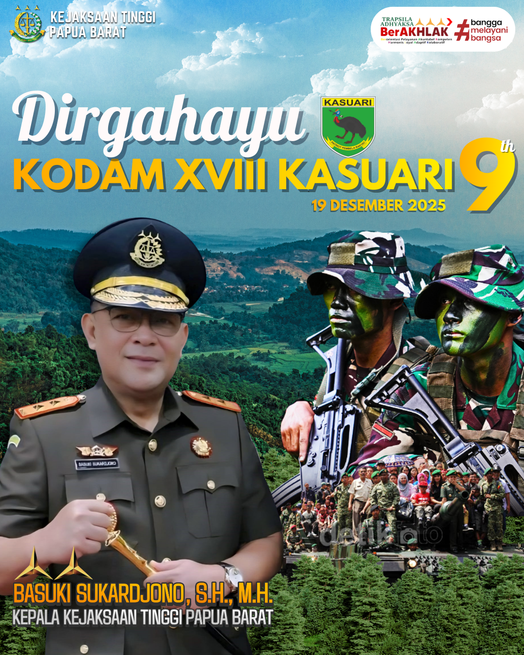 Kepala Kejaksaan Tinggi Papua Barat Basuki Sukardjono, S.H., M.H. beserta jajaran mengucapkan Dirgahayu Kodam XVIII/ Kasuari ke- 9 Tahun dengan tema “Kodam XVIII/ Kasuari, Manunggal dengan Rakyat untuk Indonesia Bersatu, Berdaulat, Sejahtera dan Maju.