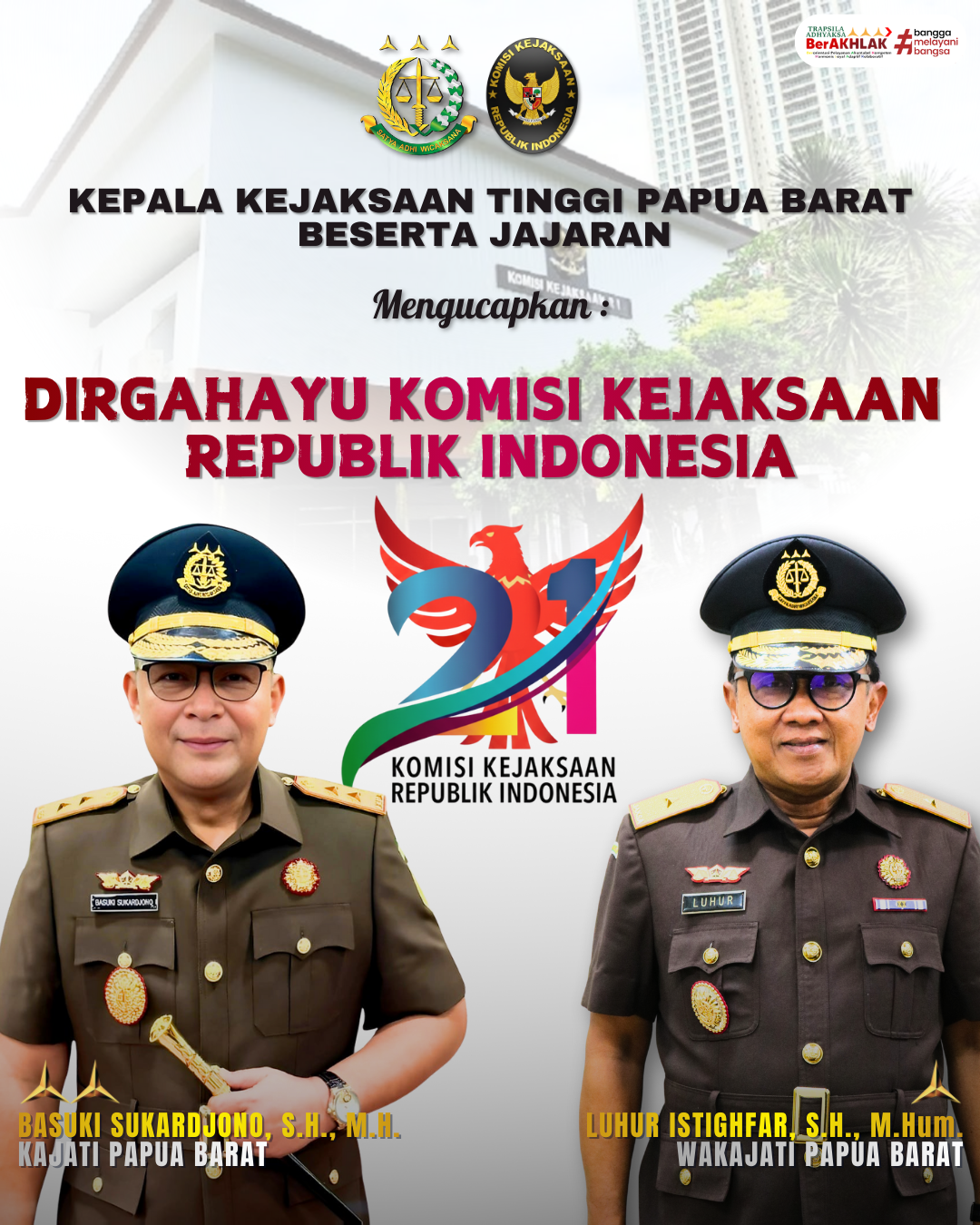 Kepala Kejaksaan Tinggi Papua Barat Basuki Sukardjono, S.H., M.H. beserta seluruh jajaran mengucapkan Selamat Ulang Tahun ke-21 Komisi Kejaksaan Republik Indonesia.