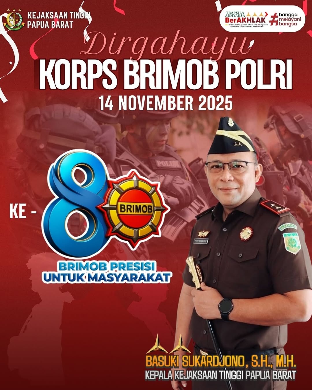Kepala Kejaksaan Tinggi Papua Barat Basuki Sukardjono, S.H., M.H. beserta jajaran mengucapkan Dirgahayu Korps Brimob yang Ke 80 Tahun. 14 November 2025 dengan tema “Brimob Presisi Untuk Masyarakat”.