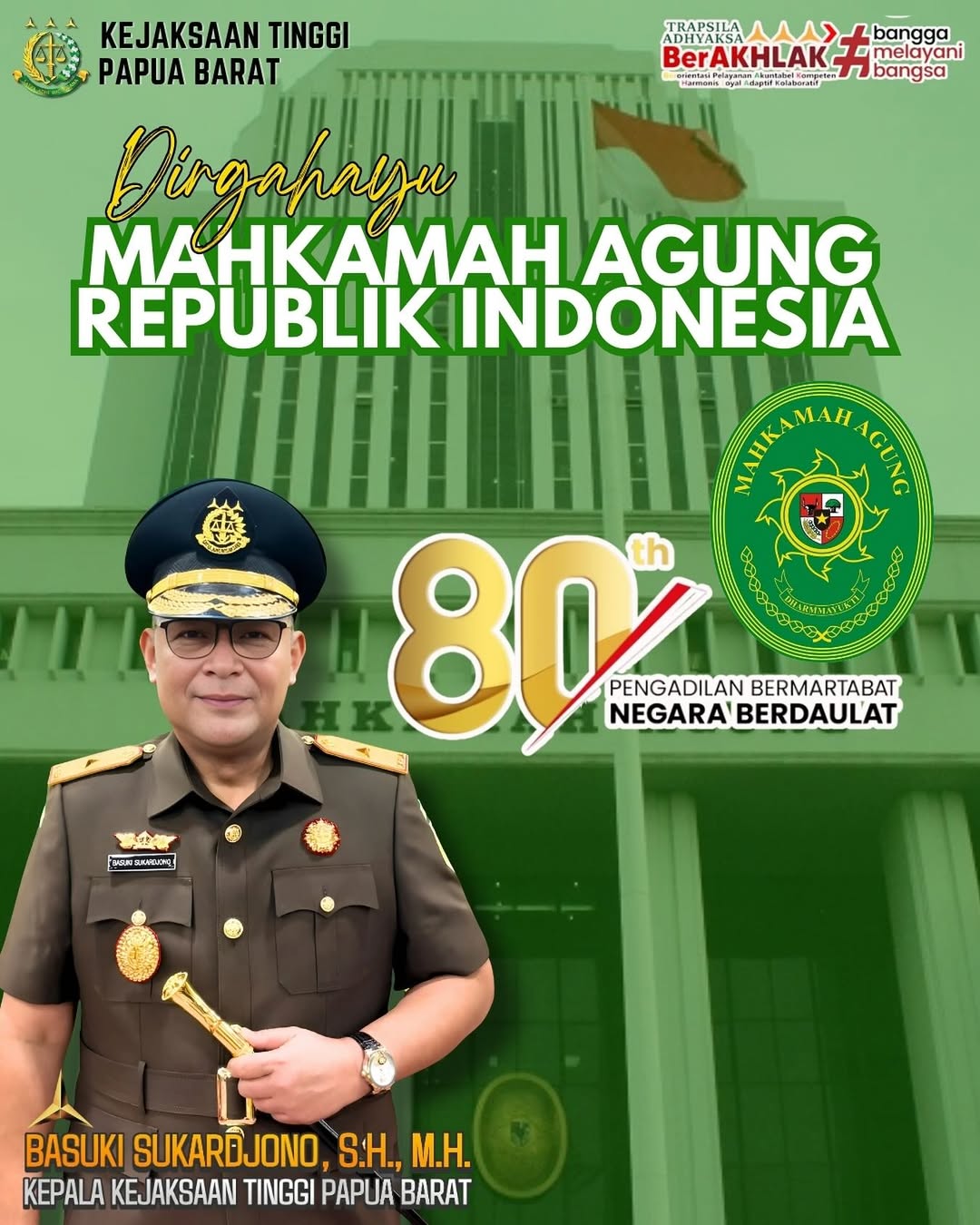 Kepala Kejaksaan Tinggi Papua Barat Basuki Sukardjono, S.H., M.H. beserta jajaran mengucapkan Dirgahayu Mahkamah Agung ke- 80 dengan tema “Pengadilan Bermartabat Negara Berdaulat”.
