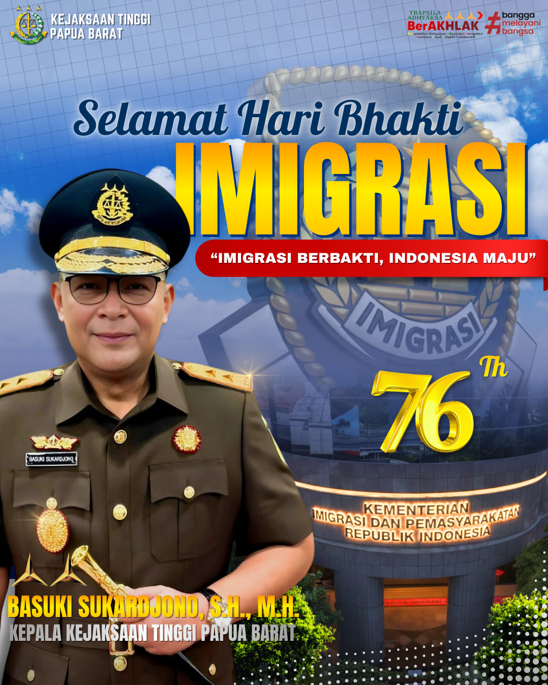 Kepala Kejaksaan Tinggi Papua Barat Basuki Sukardjono, S.H., M.H. Beserta Jajaran Mengucapkan Selamat Hari Bhakti Imigrasi ke- 76 Tahun dengan mengusung tema : “Imigrasi Berbakti, Indonesia Maju”.