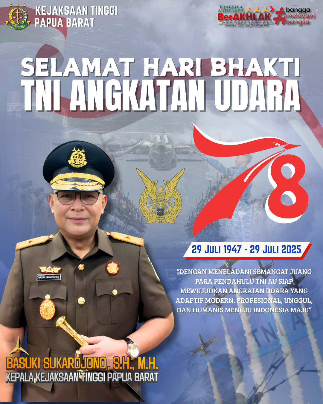Kepala Kejaksaan Tinggi Papua Barat Basuki Sukardjono, S.H., M.H. beserta jajaran mengucapkan Selamat Hari Bhakti TNI Angkatan Udara ke- 78 Tahun 2025.
