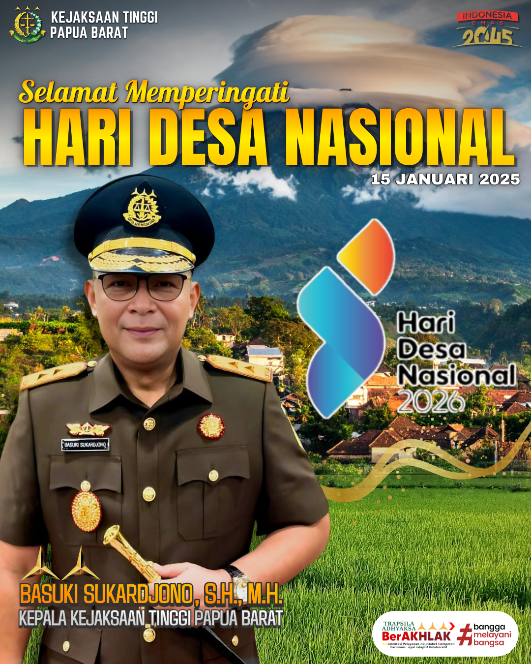 Kepala Kejaksaan Tinggi Papua Barat Basuki Sukardjono, S.H., M.H. beserta jajaran mengucapkan Selamat Memperingati Hari Desa Nasional Tahun 2026 dengan tema “”Bangun Desa, Bangun Indonesia. Desa Terdepan untuk Indonesia”.