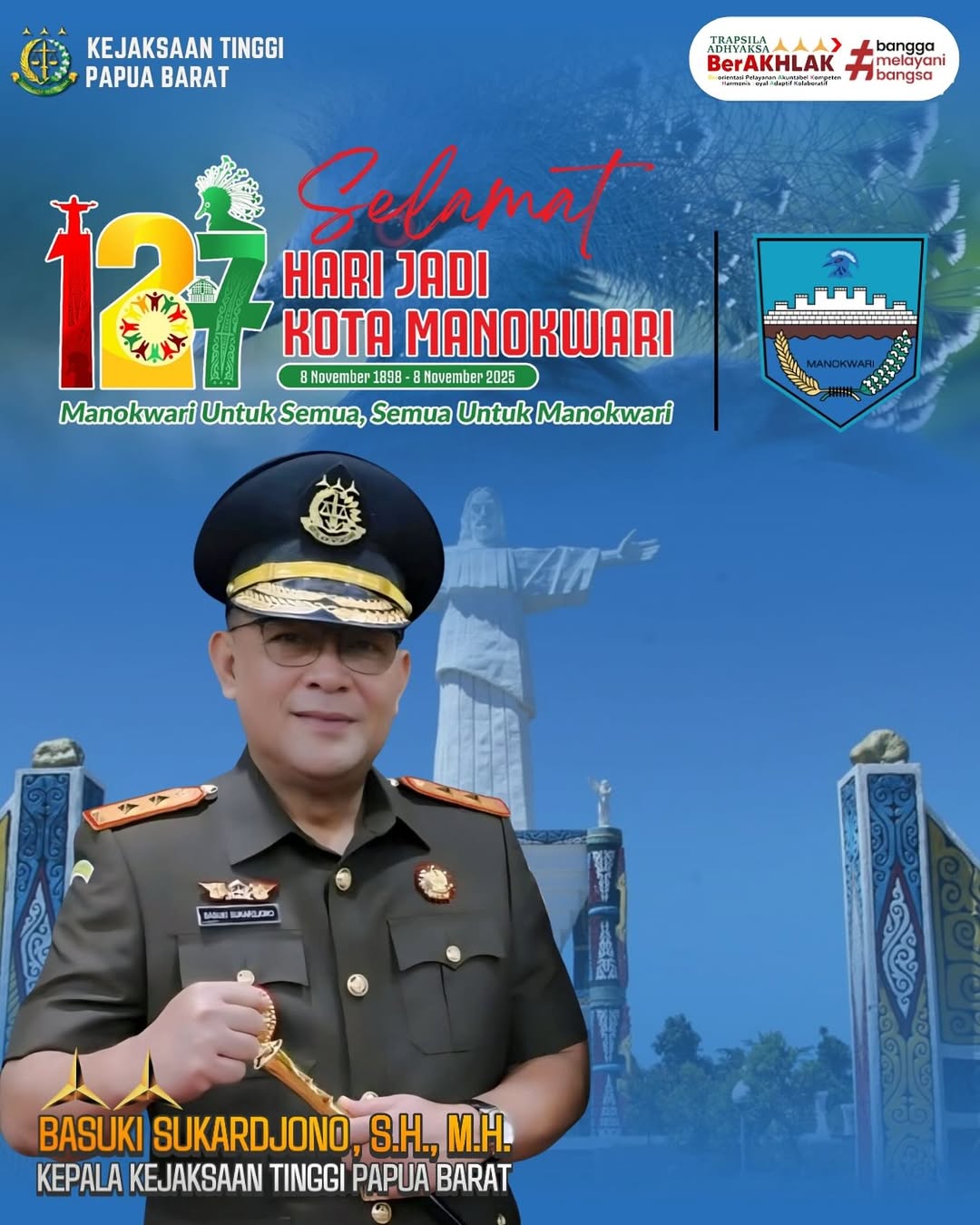 Kepala Kejaksaan Tinggi Papua Barat Basuki Sukardjono, S.H., M.H. beserta jajaran mengucapkan Selamat Hari Ulang Tahun Manokwari yang Ke 127 Tahun. 08 November 2025 dengan tema “Manokwari untuk semua, semua untuk Manokwari”.