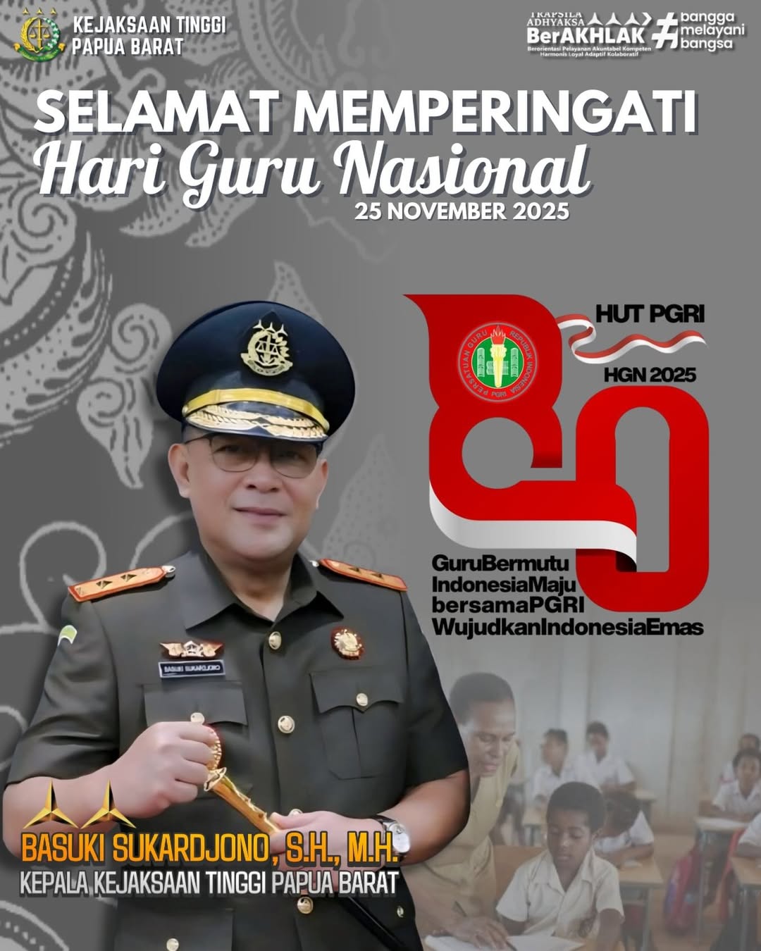 Kepala Kejaksaan Tinggi Papua Barat Basuki Sukardjono, S.H., M.H. beserta jajaran mengucapkan Selamat Memperingati Hari Guru Nasional- 25 November 2025.