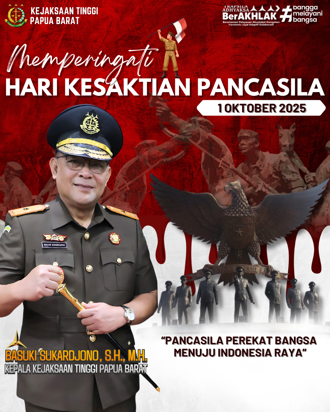 Kepala Kejaksaan Tinggi Papua Barat Basuki Sukardjono, S.H., M.H. beserta jajaran mengucapkan Selamat Memperingati Hari Kesaktian Pancasila 01 Oktober 2025 dengan tema “Pancasila Perekat Bangsa Menuju Indonesia Raya”.