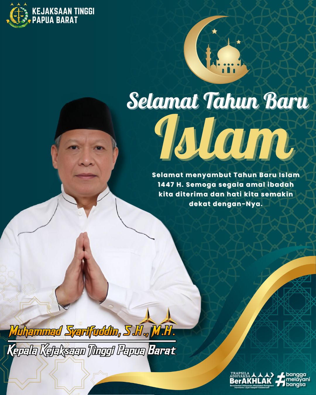 Kepala Kejaksaan Tinggi Papua Barat Muhammad Syarifuddin, S.H., M.H. beserta jajaran mengucapkan Selamat Tahun Baru Islam 1447 Hijriyah dengan tema “Selamat menyambut tahun baru Islam 1447 H. Semoga segala amal ibadah kita diterima dan hati kita semakin dekat dengannya”.