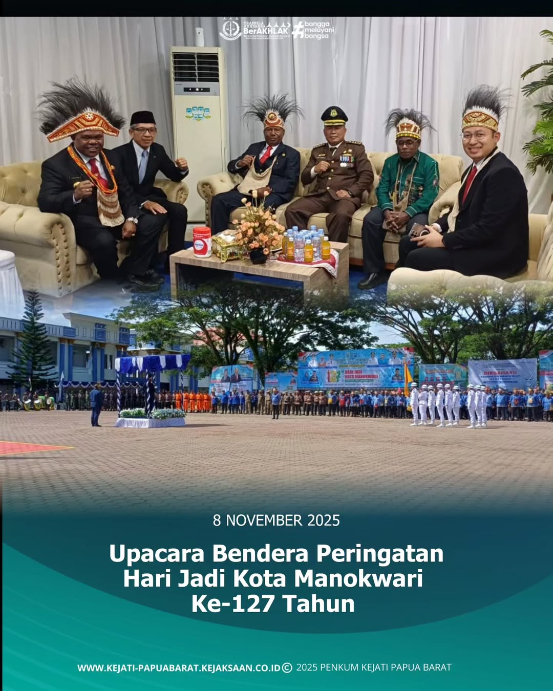 Pada hari Sabtu 8 November 2025 bertempat di Halaman Kantor Bupati dalam rangka Upacara Bendera Peringatan Hari Jadi Kabupaten Manokwari Ke-127 Tahun yang di hadiri oleh Asisten Tindak Pidana Militer, Kolonel Laut (H) Ridho Sihombing, S.H., M.H. mewakili Kepala Kejaksaan Tinggi Papua Barat.