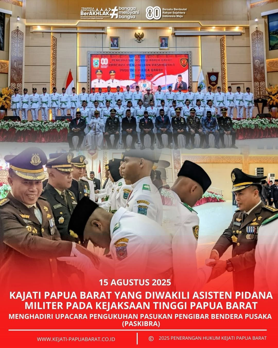 Jumat 15 Agustus 2025 bertempat di Gedung PKK Komplek Perkantoran Gubernur Papua Barat, Kepala Kejaksaan Tinggi Papua Barat yang Di wakili oleh Asisten Pidana Militer RIDHO SIHOMBING, S.H., M.H menghadiri Upacara Pengukuhan Pasukan Pengibaran Bendera Pusaka (PASKIBRA).