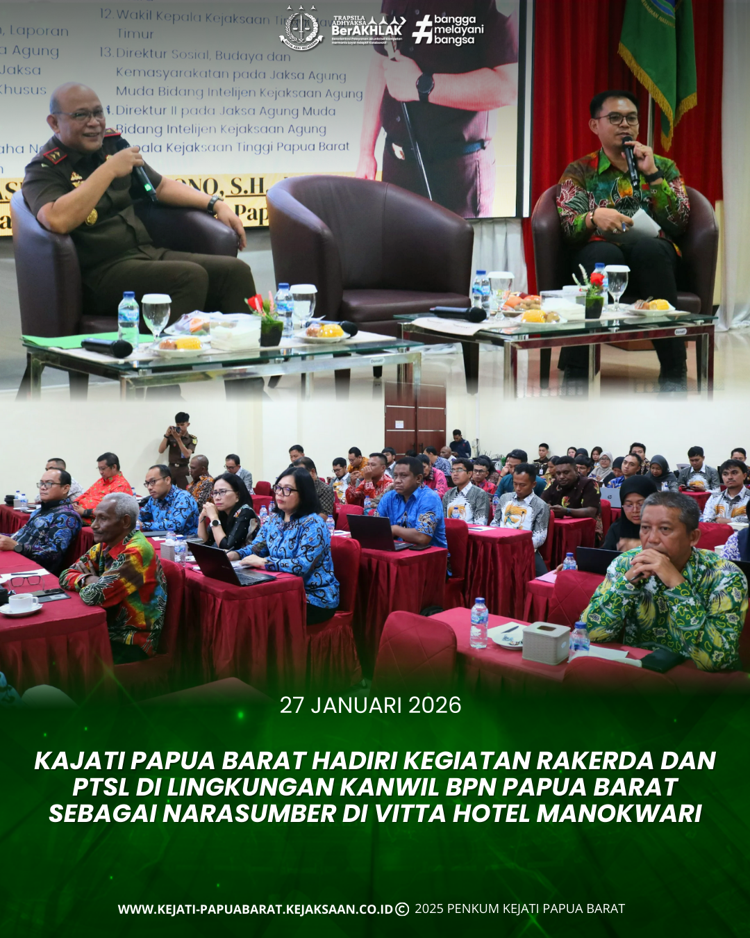 Selasa, 27 Januari 2025 pukul 14.30 WIT bertempat di Aula Hotel Vitta Manokwari, Kepala Kejaksaan Tinggi Papua Barat Basuki Sukardjono, S.H., M.H. didampingi Asisten Intelijen Kejaksaan Tinggi Papua Barat Makrun, S.H., M.H. Menghadiri undangan Kegiatan Rapat Kerja Daerah dan Pelaksanaan Pendaftaran Tanah Sistematis Lengkap (PTSL) di Lingkungan Kantor Wilayah Badan Pertanahan Nasional Provinsi Papua Barat sebagai Narasumber, dengan membawakan judul materi “Pengamanan Aset Dalam Rangka Legalisasi Aset”.