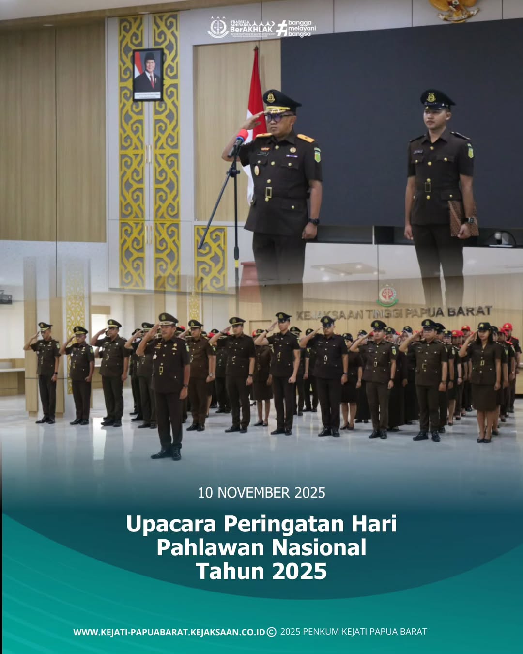 Pada hari Senin, 10 November 2025 bertempat di Aula Lantai 4 Kantor Kejaksaan Tinggi Papua Barat dilaksanakan Upacara Peringatan Hari Pahlawan Nasional Tahun 2025 yang dipimpin oleh Plh. Kepala Kejaksaan Tinggi Papua Barat, Luhur Istighfar, S.H., M.Hum. diikuti oleh seluruh Pegawai, serta CPNS pada Kejaksaan Tinggi Papua Barat dan Kejaksaan Negeri Manokwari.