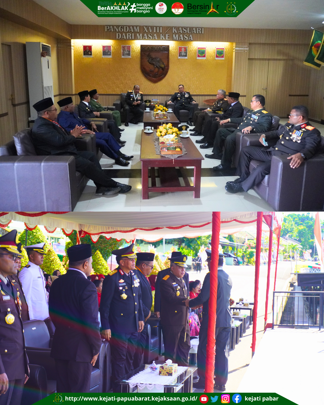 Kamis, 5 Oktober 2023, Kepala Kejaksaan Tinggi Papua Barat Dr. Harli Siregar, S.H. M.Hum didampingi Asisten Pidana Militer Kolonel Laut (H) Ridho Sihombing, S.H., M.H mengikuti Upacara Peringatan HUT ke-78 TNI bertempat di Kodam XVIII Kasuari.