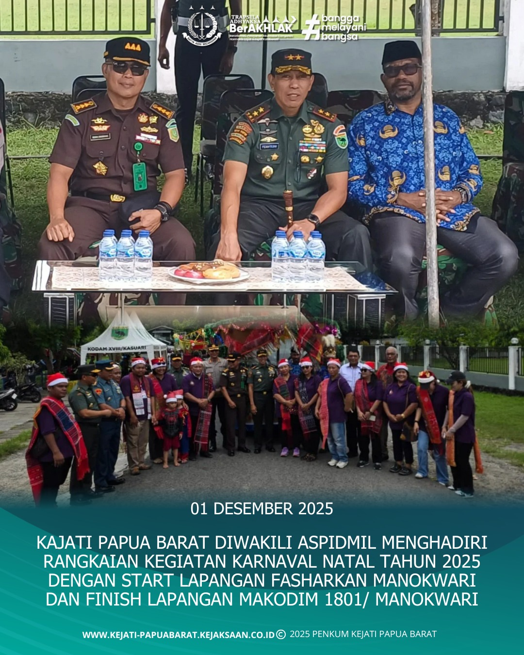 Senin 1 Desember 2025 Pukul 12.30 WIT, Kepala Kejaksaan Tinggi Papua Barat yang diwakili oleh Asisten Pidana Militer Kolonel Laut (KH) Ridho Sihombing, S.H., M.H. Menghadiri Rangkaian Kegiatan Karnaval Natal Tahun 2025 Dengan Start Lapangan Fasharkan Manokwari dan Finish Lapangan Makodim 1801/ Manokwari.