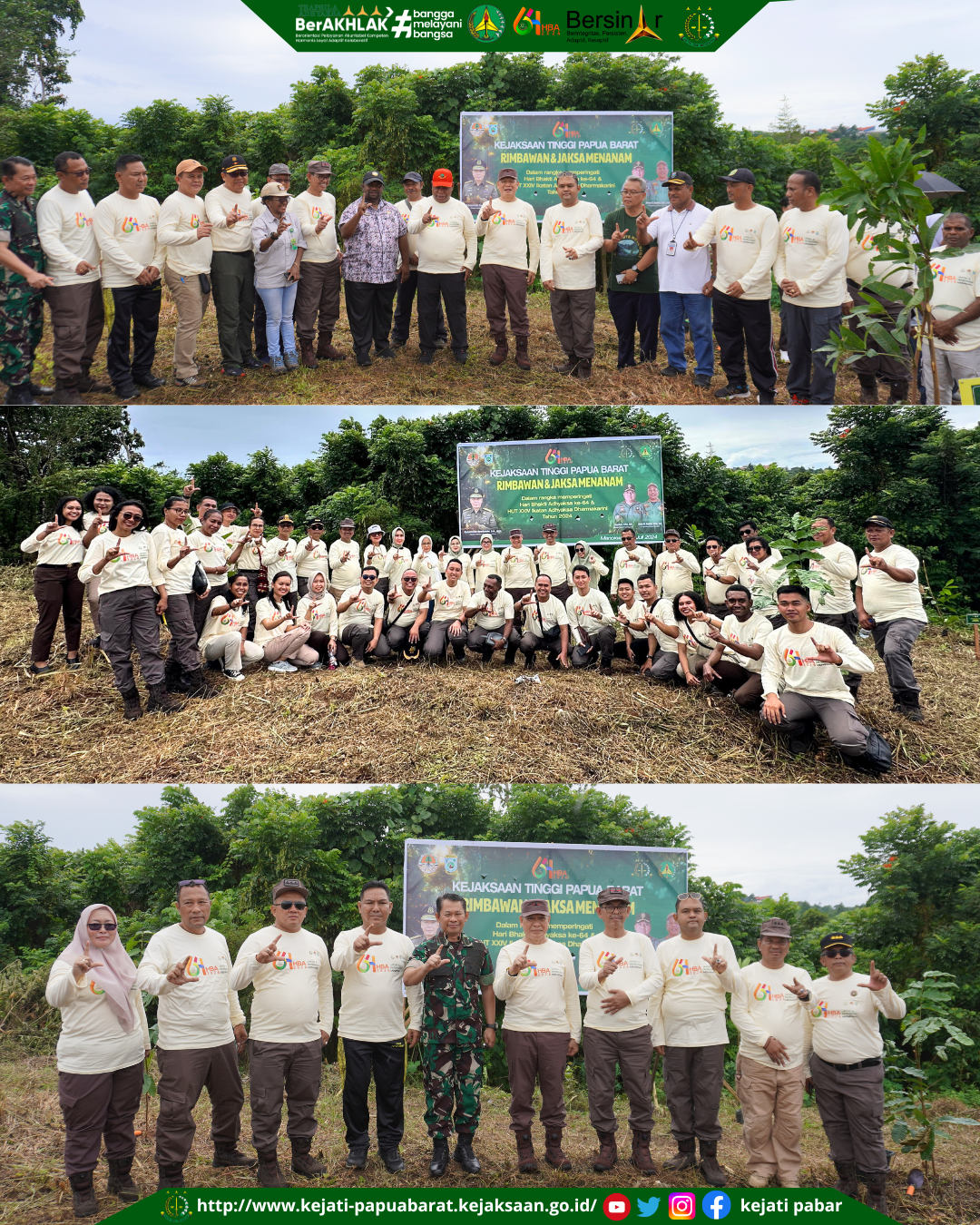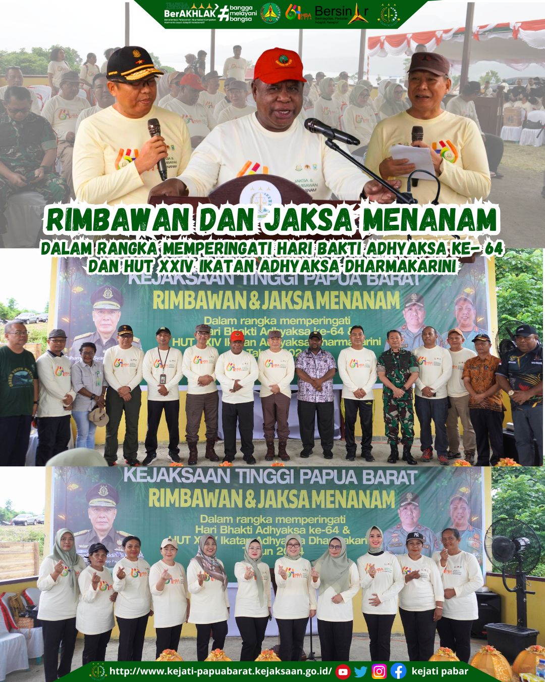 Jumat 19 Juli 2024 pukul 08.00 WIT s.d. 10.00 WIT, Kejaksaan Tinggi Papua Barat yang dipimpin oleh Kepala Kejaksaan Tinggi Papua Barat Muhammad Syarifuddin, S.H., M.H. dan Ketua IAD Wilayah Papua Barat Ny. Mila Syarifuddin beserta Keluarga Besar Kejaksaan Tinggi Papua Barat melaksanakan kegiatan Rimbawan dan Jaksa Menanam, bertempat di Kampung Mawes, Arfai, Distrik Manokwari, Kabupaten Manokwari, Provinsi Papua Barat.