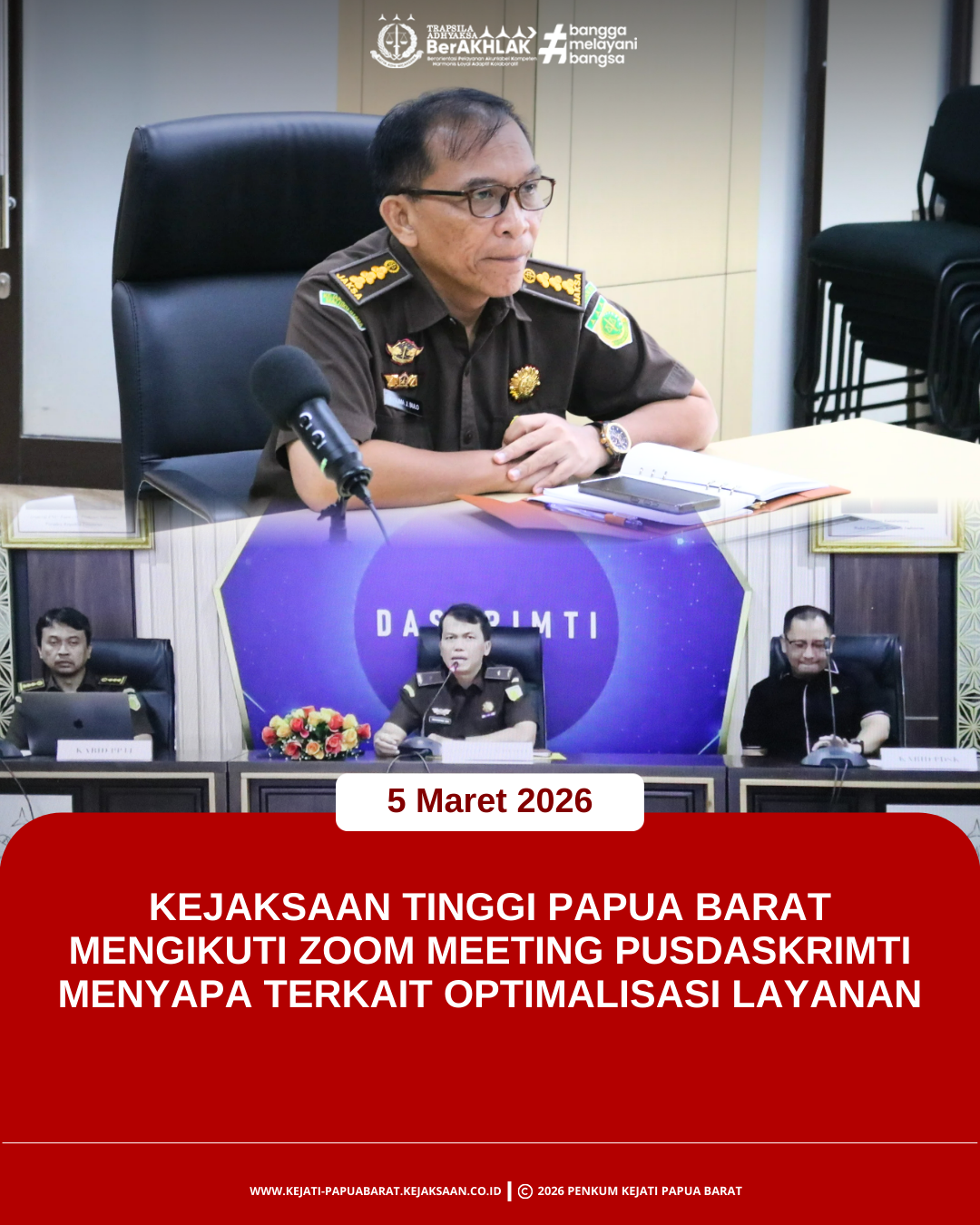 Kamis, 5 Maret 2026 pukul 11.00 WIT bertempat di Ruang Vicon Lantai 2 Kantor Kejaksaan Tinggi Papua Barat, Asisten Pembinaan Kusuma Jaya Bulo, S.H., M.H. didampingi Asisten Tindak Pidana Khusus Agustiawan Umar, S.H., M.H. dan Asisten Tindak Pidana Umum yang diwakili Kepala Seksi A (Tindak Pidana Orang dan Harta Benda) Joko Suryanto, S.H., M.H. mengikuti zoom meeting Pusdaskrimti Menyapa dengan tema pembahasan ”Optimalisasi Layanan”.
