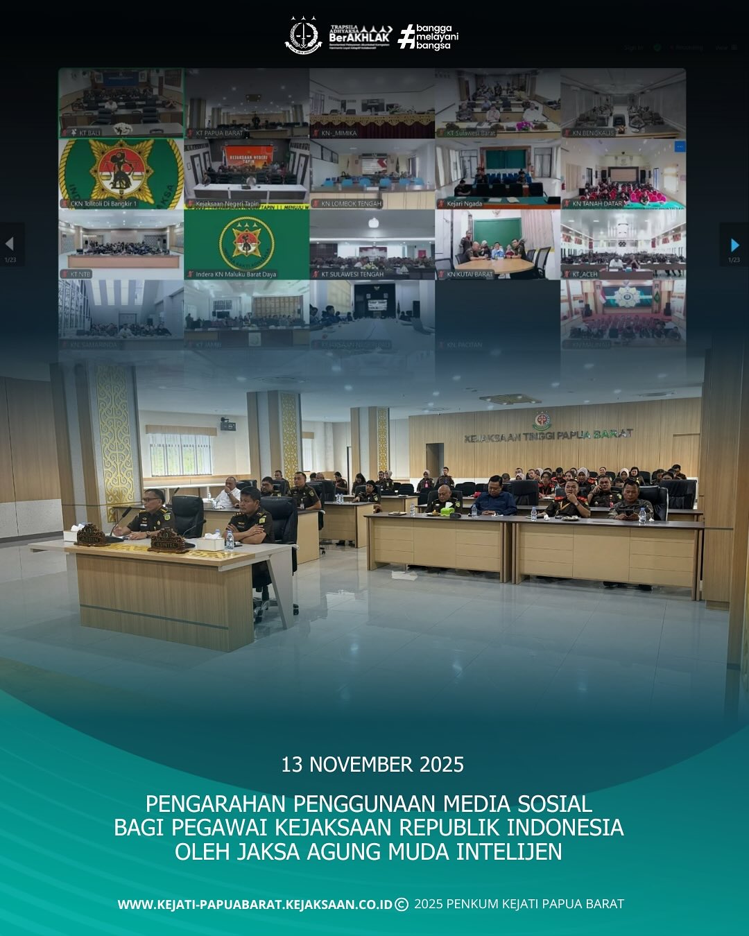 Pada hari Kamis, 13 November 2025 bertempat di Aula Kejaksaan Tinggi Papua Barat, telah dilaksanakan kegiatan pembinaan terkait penguatan integritas dalam penggunaan media sosial, yang diselenggarakan secara virtual (Zoom) oleh Jaksa Agung Muda Intelijen. Kegiatan ini dihadiri oleh Asisten Pembinaan, Asisten Intelijen, Asisten Tindak Pidana Umum, Asisten Tindak Pidana Militer, Asisten Pengawasan, Para Koordinator dan seluruh Kasi Kasubag serta seluruh pegawai pada Kejaksaan Tinggi Papua Barat.