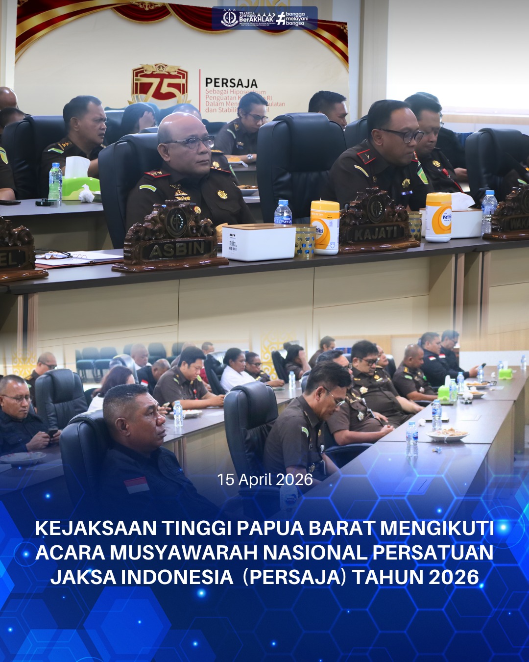 Rabu 15 April 2026 pukul 10.30 WIT bertempat di Aula Lantai 4 Kantor Kejaksaan Tinggi Papua Barat, Kepala Kejaksaan Tinggi Papua Barat Basuki Sukardjono, S.H., M.H. beserta seluruh jajaran mengikuti Acara Musyawarah Nasional Persatuan Jaksa Indonesia Tahun 2026.