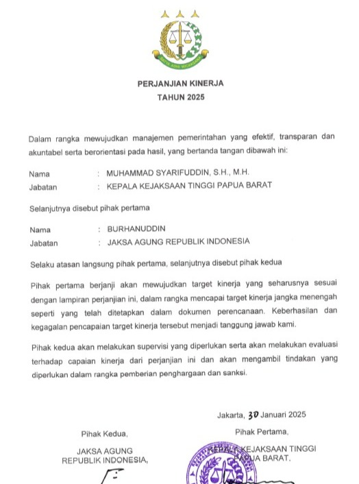 Kejaksaan tinggi Papua Barat telah membuat Rancangan awal Rencana Strategis 2025-2029, Rencana Kerja Tahun 2025, dan Perjanjian Kinerja Kepala Satuan Kerja Tahun 2025.