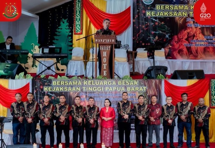 Ibadah dihadiri Kepala Kejaksaan Tinggi Papua Barat Juniman Hutagaol, S.H., M.H bersama Ketua Ikatan Adhyaksa Dharmakarini Wilayah Papua Barat Yanti Juniman dan Asintel Erwin Saragih selaku Ketua Panitia Natal dan seluruh pegawai Nasrani Kejati Papua Barat dan Kejari Manokwari serta tamu undangan.