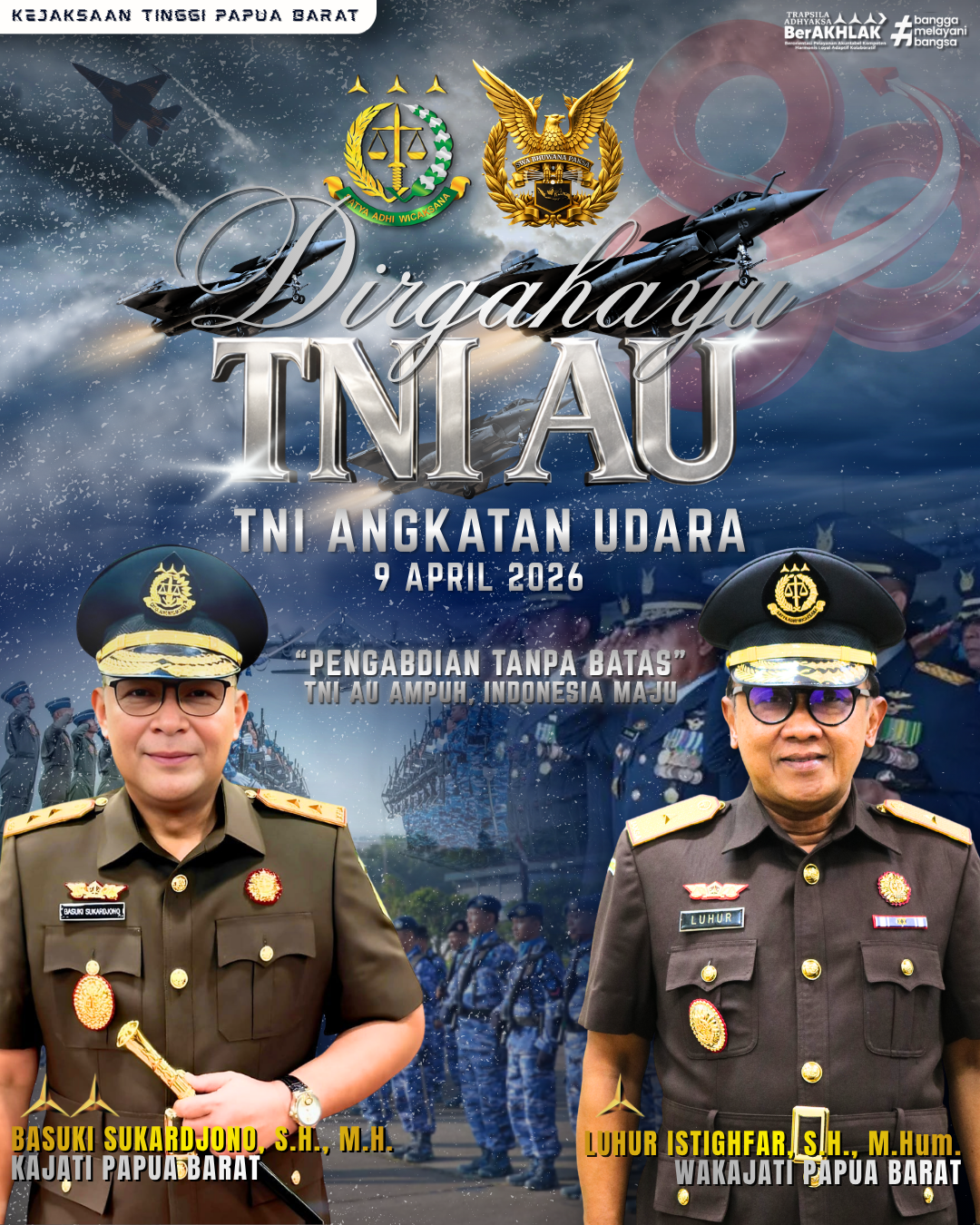 Kepala Kejaksaan Tinggi Papua barat Basuki Sukardjono, S.H., M.H. dan Wakil Kepala Kejaksaan Tinggi Papua Barat Luhur Istighfar, S.H., M.H. beserta jajaran mengucapkan Dirgahayu TNI Angkatan Udara dengan tema “Pengabdian Tanpa Batas” TNI AU Ampuh, Indonesia Maju.