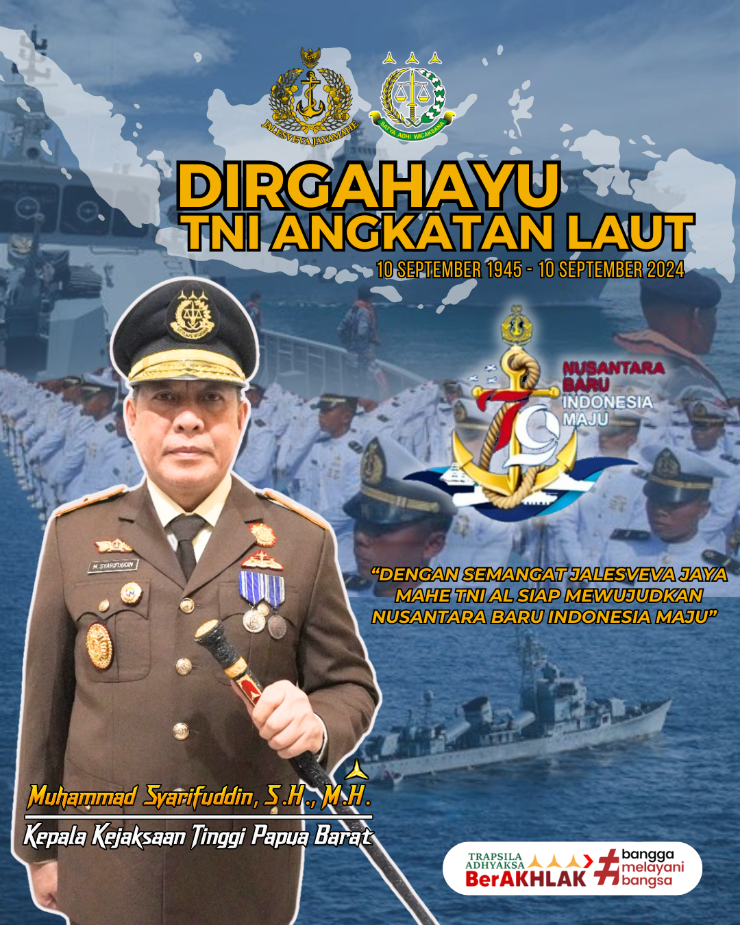 Kepala Kejaksaan Tinggi Papua Barat Muhammad Syarifuddin, S.H., M.H. beserta jajaran mengucapkan Dirgahayu TNI Angkatan Laut Ke- 79 (10 september 1945 – 10 September 2024) dengan tema “Dengan Semangat Jalesveva Jaya mahe TNI AL Siap Mewujudkan Nusantara baru Indonesia Maju”.