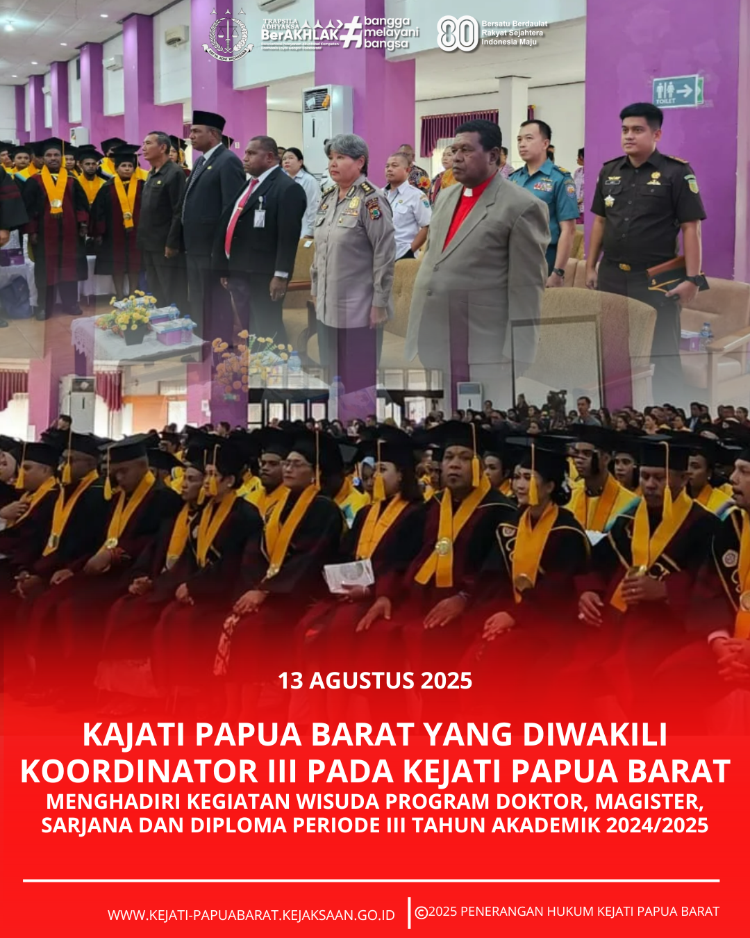 Rabu 13 Agustus 2025 bertempat di Aula Utama Universitas Papua, Kepala Kejaksaan Tinggi Papua Barat yang diwakili Koordinator III pada Kejaksaan Tinggi Papua Barat Adi Bayu Kusuma, S.H., M.H. menghadiri kegiatan wisuda program doktor, magister, sarjana dan diploma periode III tahun akademik 2024/2025.