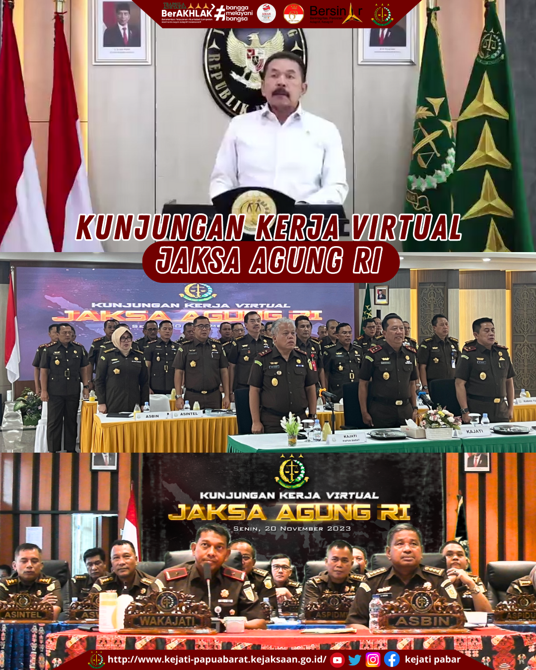 Jaksa Agung ST Burhanuddin memberikan pengarahan pada acara Kunjungan Kerja Virtual Jaksa Agung yang diselenggarakan pada Senin 20 November 2023 pukul 14.00 WIB. Kunjungan Kerja Virtual kali ini diselenggarakan dalam rangka evaluasi dan pengingat bagi seluruh Insan Adhyaksa terhadap setiap arahan Jaksa Agung, baik yang telah diterbitkan dalam bentuk baik Surat, Surat Edaran, Instruksi, Keputusan, Pedoman Jaksa Agung maupun Peraturan Kejaksaan.