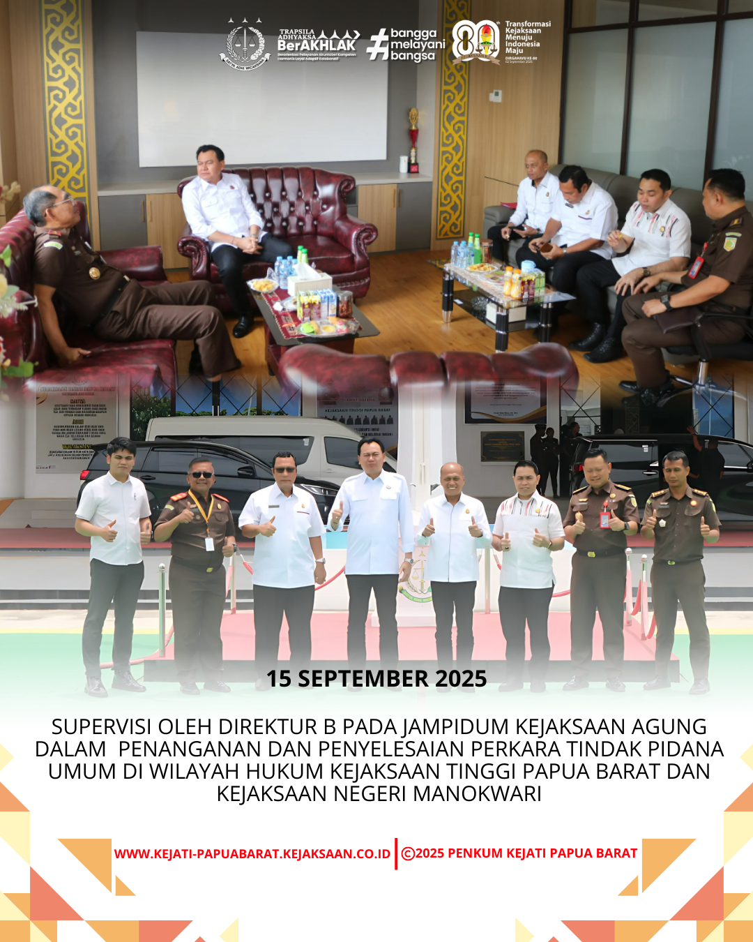 Senin, 15 September 2025 bertempat di Ruang Kerja Plh. Kepala Kejaksaan Tinggi Papua Barat, Tim Direktru B pada Jaksa Agung Muda Tindak Pidana Umum Kejaksaan Agung melakukan Supervisi di Kejaksaan Tinggi Papua Barat dan Kejaksaan Negeri Manokwari terkait Penanganan dan Penyelesaian Perkara Tindak Pidana Umum.